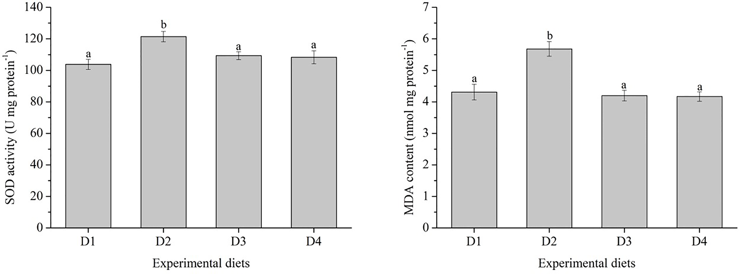 The SOD activity and MDA content in fish fed with D2 diet were significantly higher than those fed with D1, D3 and D4 diets (P < 0.05) (Figure 1).