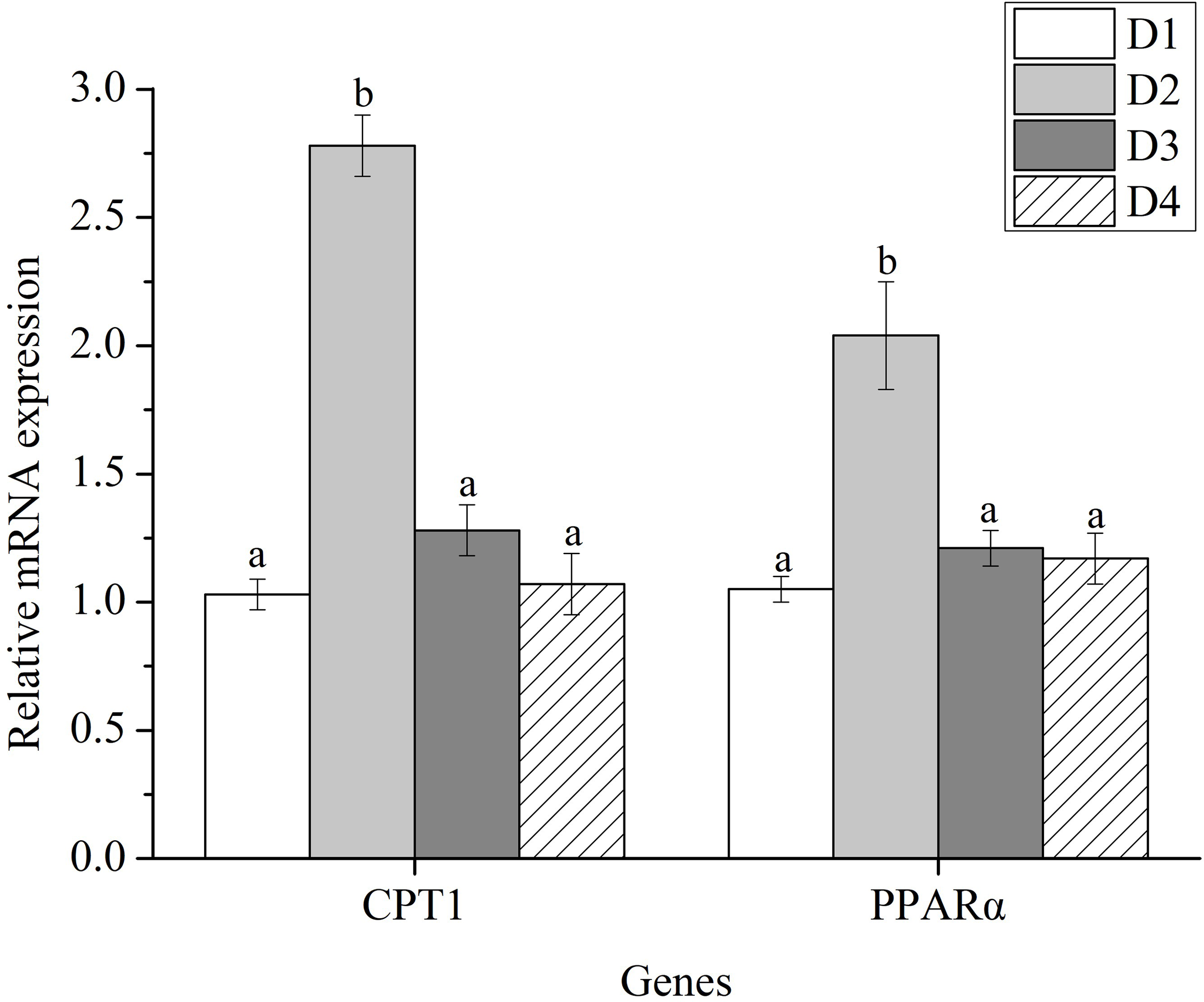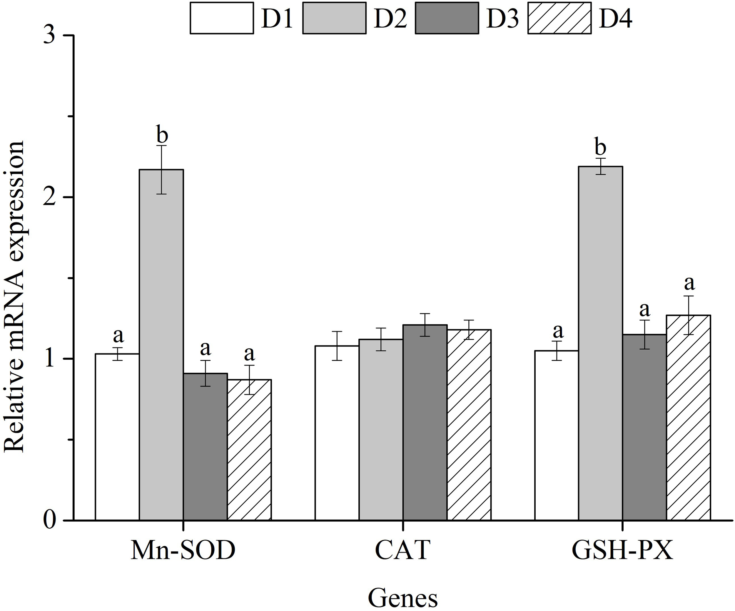 The mRNA levels of manganese superoxide dismutase (Mn-SOD) and glutathione peroxidase (GSH-PX) in fish fed with D2 diets were significantly higher than those fed with D1, D3 and D4 diets (P < 0.05). However, there was no significant difference in the mRNA level of catalase (CAT) among all diet treatments (P > 0.05) (Figure 2).