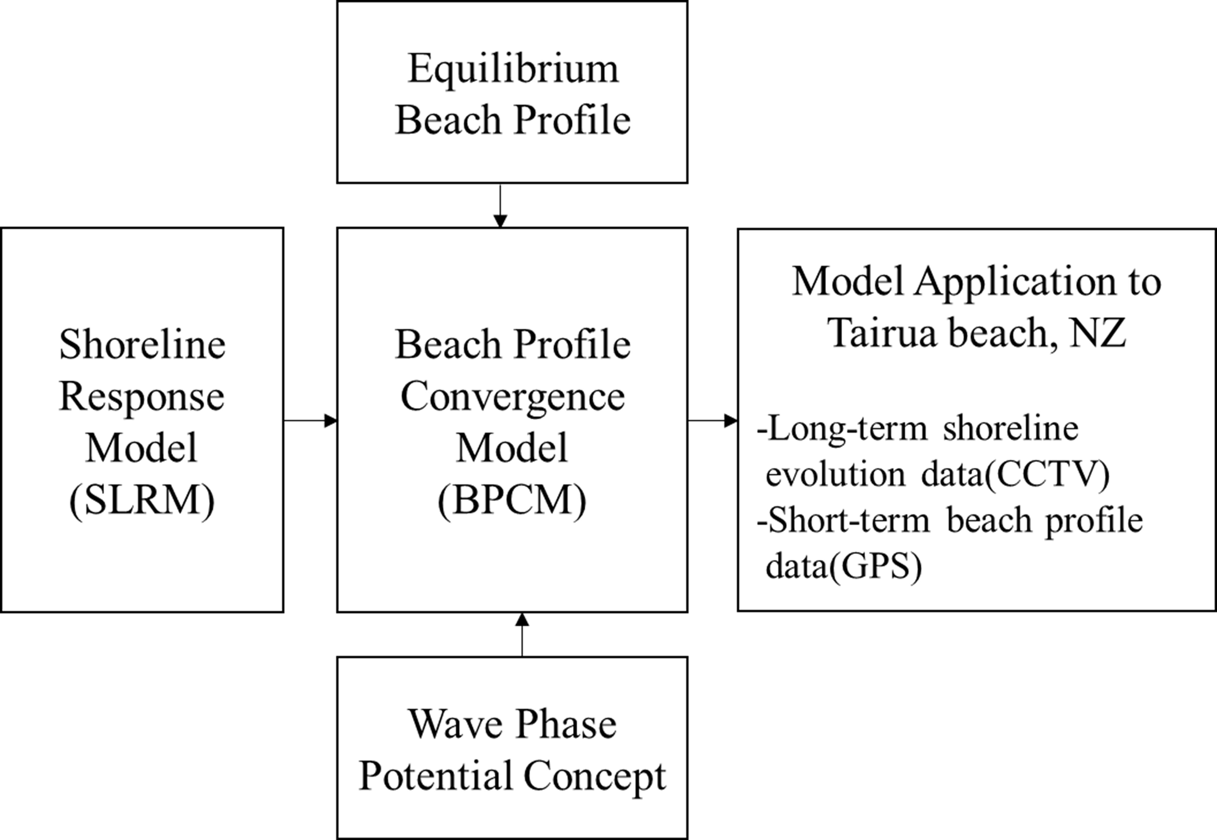 Figure 1 summarizes the contents of this study and explains the components and process of the study: The prediction of long-term beach profile evolution is derived based on the shoreline response model (SLRM), which simulates the temporal change in shoreline position as shown in the research process. Using the equilibrium beach profile, the governing equation of the beach profile convergence model (BPCM) with water depth as a variable was derived, and a numerical model was developed in which the target beach profile to converge by applying the wave phase potential was determined so that the water depth gradually converges to it. The long-term simulation validity of the model was verified using the wave and shoreline observation data taken at Tairua Beach in New Zealand by Montaño et al. (2020) to the BPCM of this study. The validity of whether detailed beach profile changes, such as bar migration, can be simulated was reviewed through a comparison with the short-term observed beach profile.