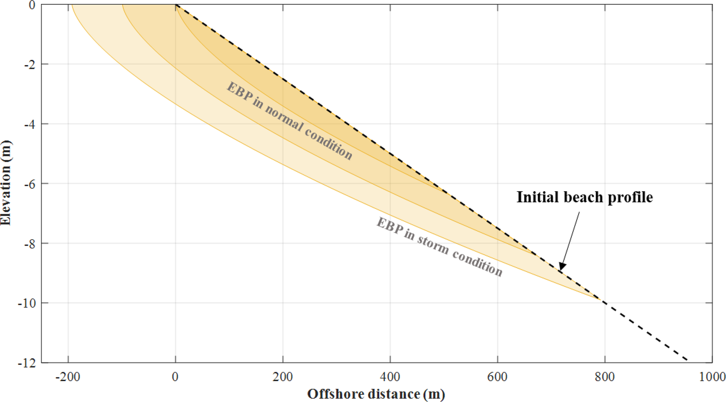 The EBP formula (Eq. 4) presented by Bruun (1954) and Dean (1977) was used to extend the ODE equation (Eq. 2), which simulates the shoreline position change with beach profile change.
