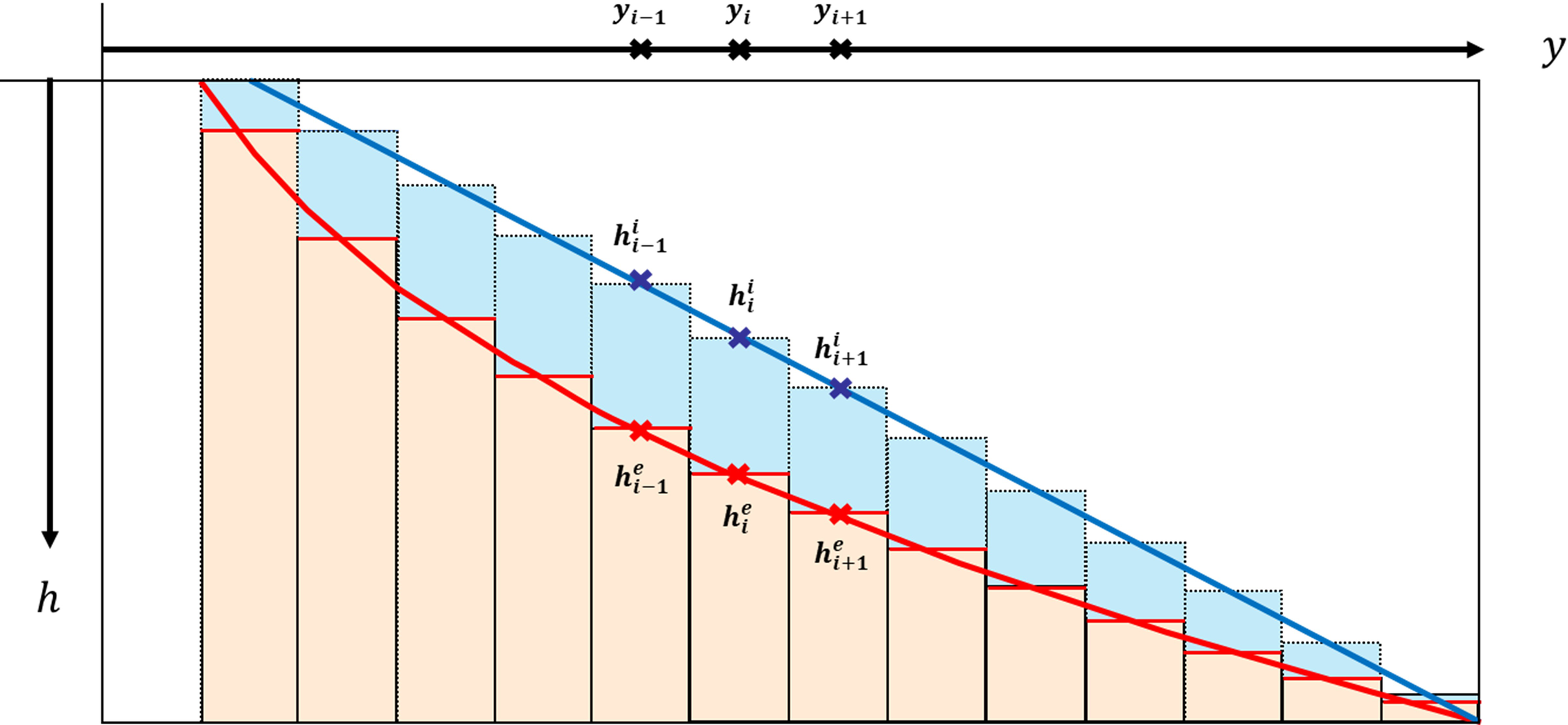 As shown in FigureĀ 3, the water depth h converges to the equilibrium water depth he. Thereafter, the governing equation (Eq. 12) is numerically analyzed by a simple finite difference with respect to time at each y point where the grid is located, as shown in Eq. (12).