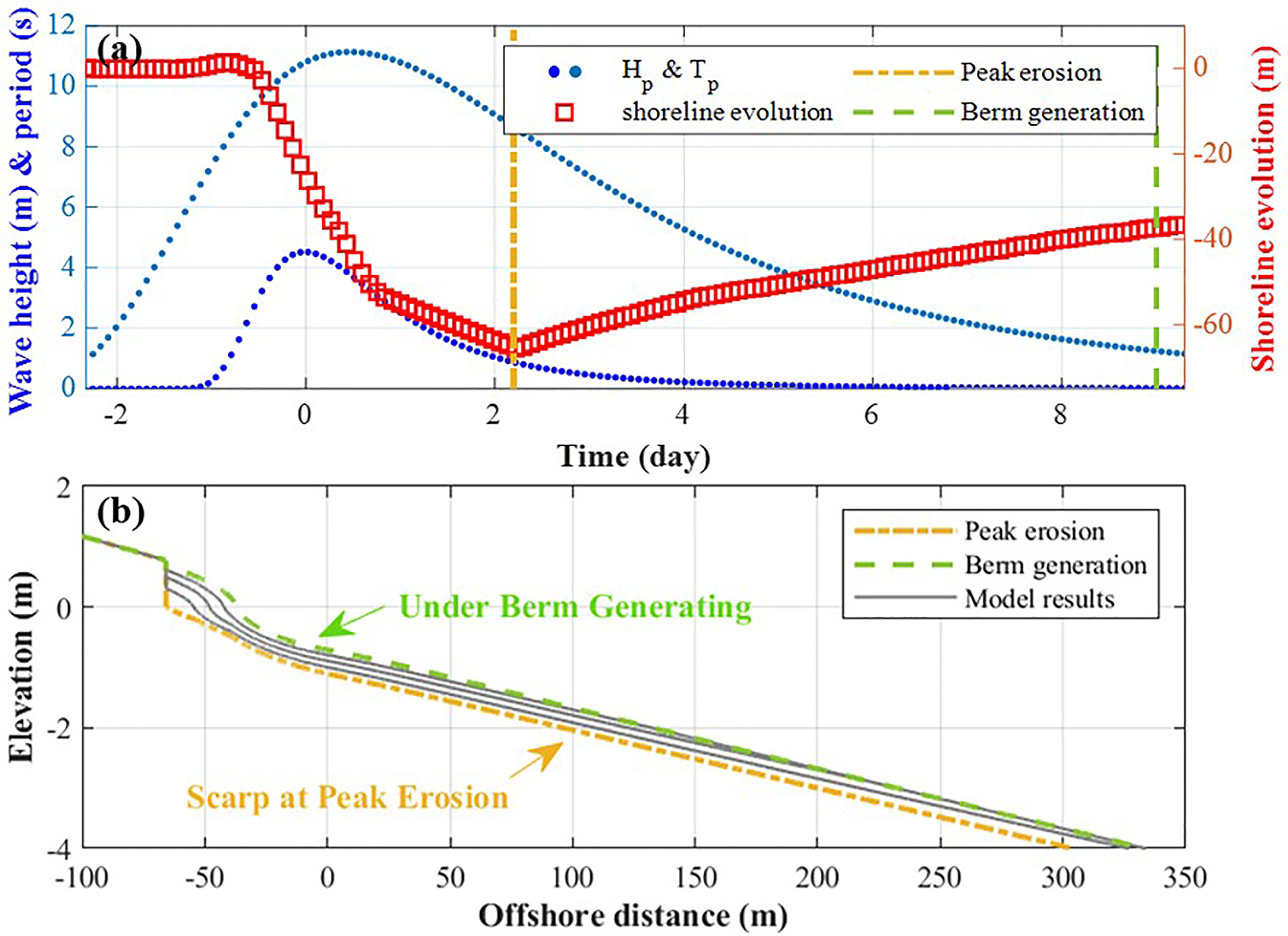 FiguresĀ 4 shows the simulated results obtained by applying the storm wave scenario function suggested by Kim etĀ al. (2021). To extract the high wave scenario, Kim etĀ al. (2021) non-dimensionalized the wave height data before and after the occurrence of the maximum wave height of the NOAA wave data across 40 years (1979ā2018) by the peak wave height and period value. A storm wave scenario function (SWSF) that fits well by taking dimensionless values with respect to the peak wave height was proposed. The SWSF for the peak wave height (Hp) of 4.5 m and peak period (Tp) of 11.1 sec were applied following the shoreline response (FigureĀ 4A) and the corresponding beach profile change result (FigureĀ 4B) according to the high wave incidence. From the simulation results, it can be confirmed that the occurrence of scarp due to high waves and the formation of berms after the extinction of high waves can be reproduced.