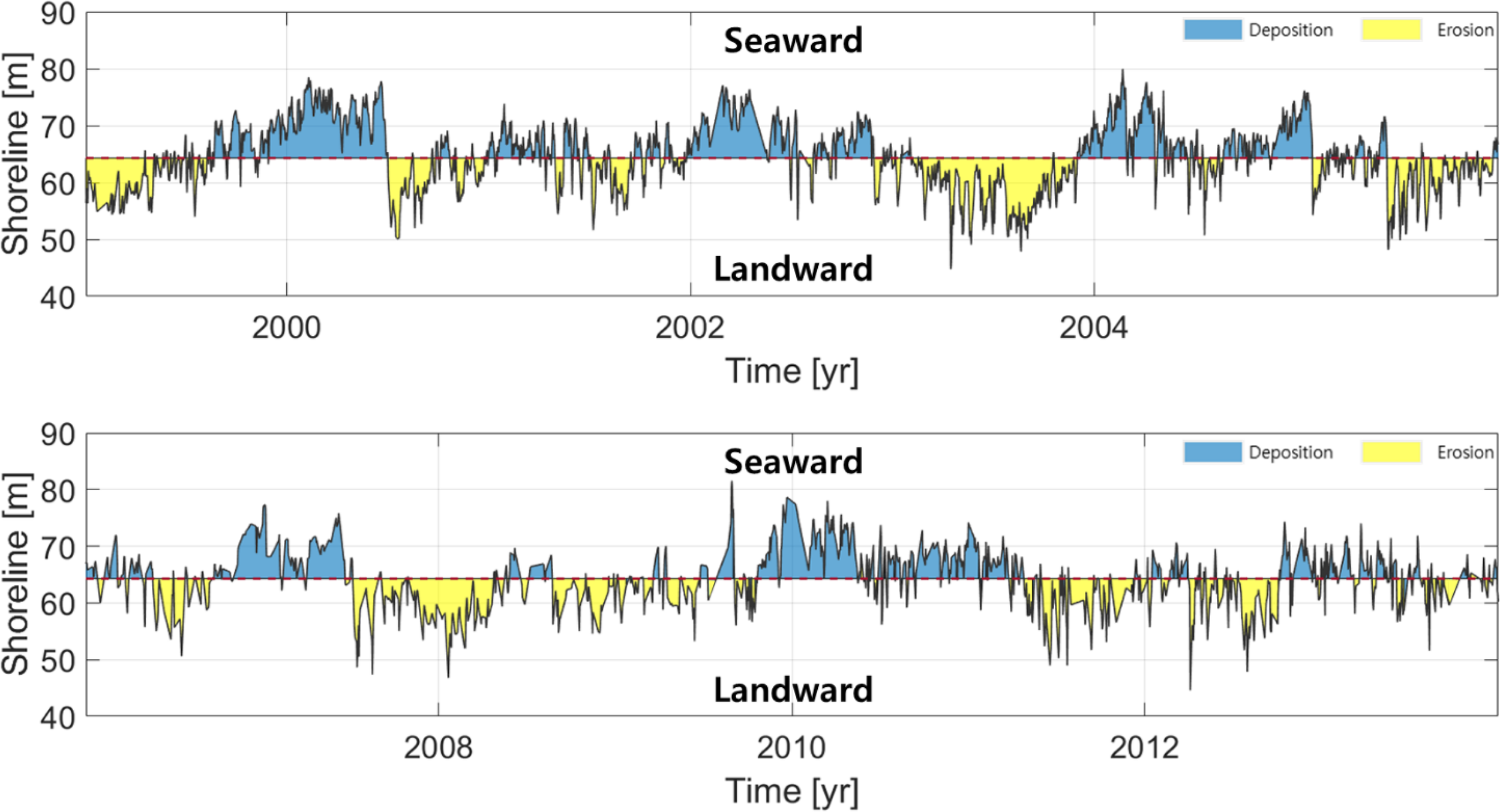 The convergence factor qr = 0.047/day was estimated from a beach scale factor (A) of 0.094 m1/3. However, this is a calculation formula obtained for the eastern coast of Korea (tidal range <30 cm), which is a microtidal environment with little effect from tides; therefore, there may be errors in the tidal environment. TableĀ 1 summarizes the input data used to simulate long-term shoreline response.