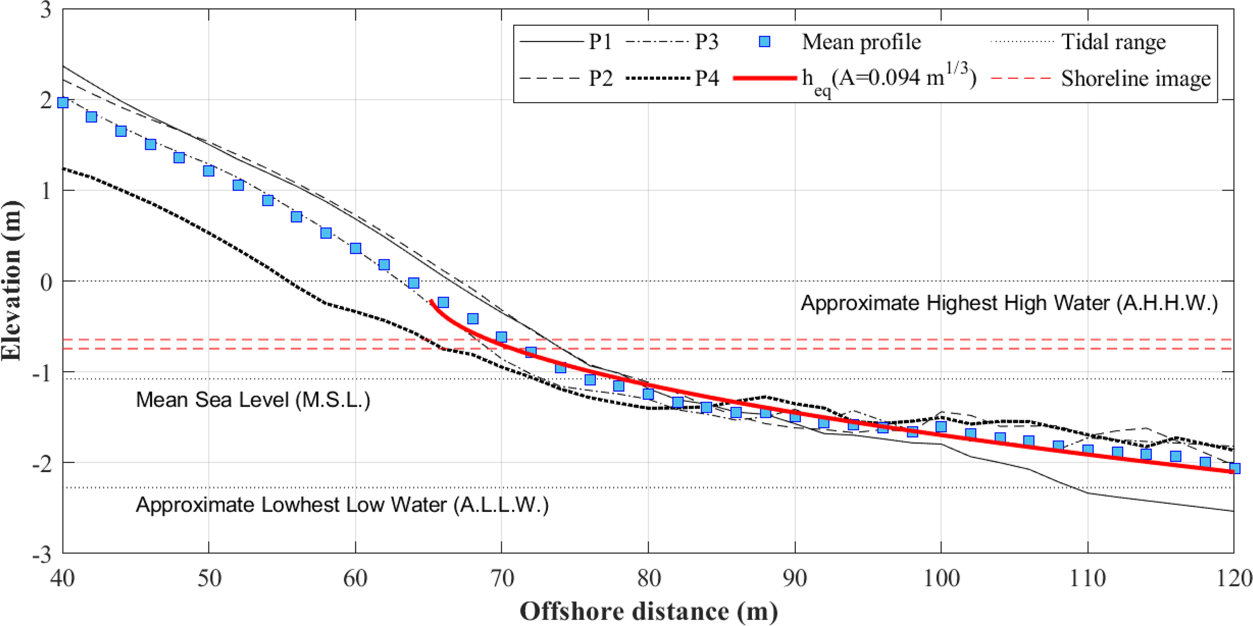 Supplementary FigureĀ 3 shows the results of the equilibrium beach profile plotted on the beach profile data provided by āShoreshopā (https://coastalhub.science/data) and shows the validity of the beach scale factor. Beach profile data were observed at four baselines (P1āP4) on March 15, 2001. By taking the average of the beach profile data, an EBP (heq) that best fits the beach scale factor of 0.094 m1/3 was obtained, as shown in FigureĀ 7. Beach scale factor A of 0.094 m1/3 was applied to the LTT, which can represent the tidal environment, the beach scale factor A of 0.094 m1/3 was applied. This corresponds to median grain size (D50) of 0.18 mm.