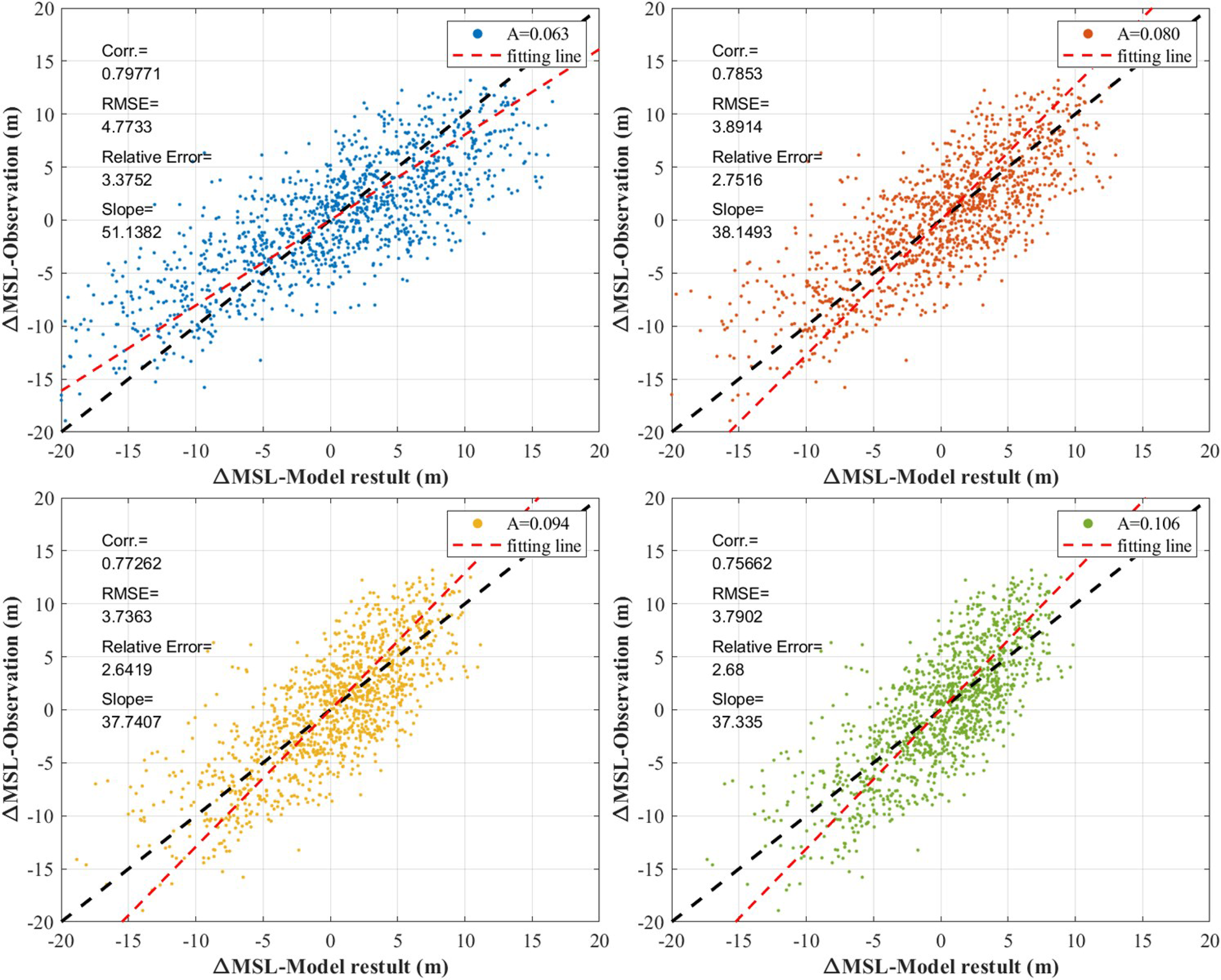 The only factor that affects the numerical values is the beach scale factor (A). The correlation coefficient (Rxy), root mean square error (RMSE), and slope θ of the fitting line were used as evaluation indicators to determine the level of similarity between the observed value and the numerical calculation value. Figure 9 shows the correlation distribution between the results of the shoreline position and the observed data according to four different beach scale factors and the fitting curves between them. The higher the correlation coefficient (Rxy), the lower the RMSE and the relative error; the closer the fitting curve slope is to 45°, the greater the similarity.