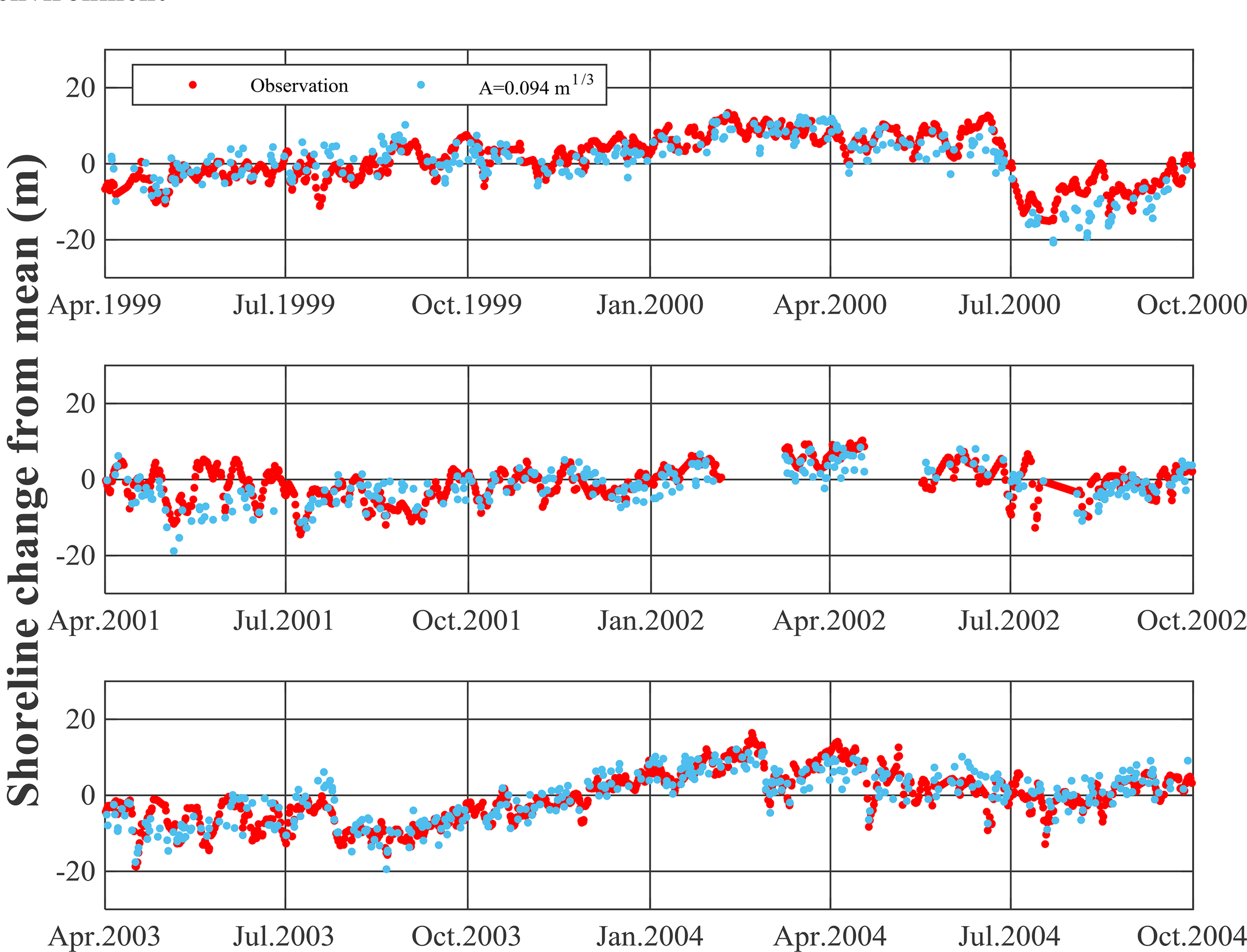 The physical basis of the ODE equation was first empirically proposed by Miller and Dean (2004) and established by Lim et al. (2021). Kim et al. (2021) and Lim et al. (2021) conducted studies on the estimation of the beach response factor ar. Lim et al. (2021) obtained their results by applying the Tairua beach wave and shoreline observation data from Montaño et al. (2020) to Eq. (6). Compared to the blind test result found by Montaño et al. (2020), the correlation coefficient was 0.74, which was satisfactory even though it was compared with the long-term observation data for approximately 11 years.