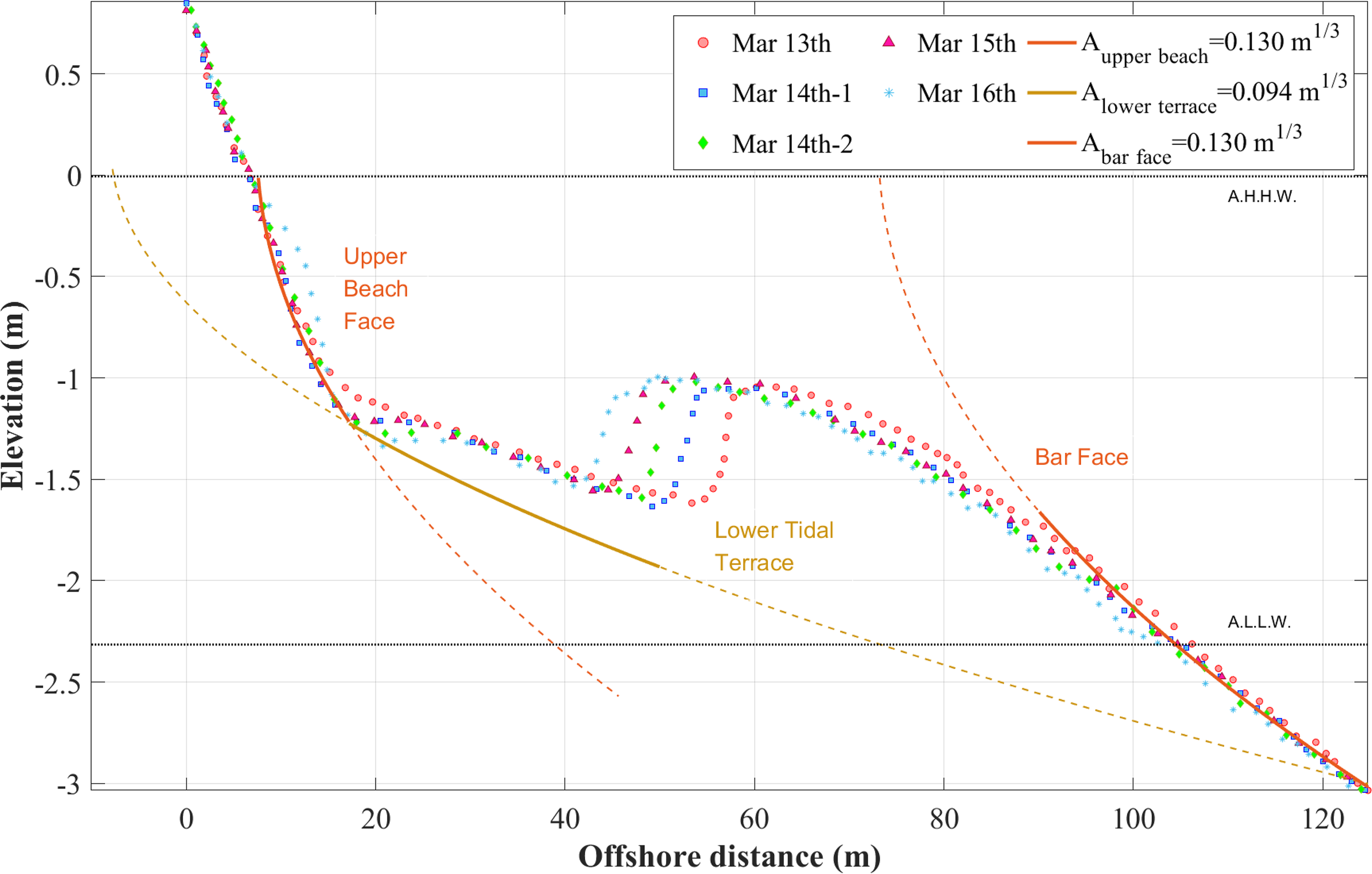 The beach profile data observed by van Maanen etĀ al. (2008) show a UBF zone and an LTT zone, as shown in FigureĀ 11, similar to the beach profile in any other tidal environment. The growth of the bar in Supplementary FigureĀ 5 shows that as the waves become relatively calm after the storm event, coarse sands suspended from the UBF and moving seaward were deposited in the LTT, forming a bar, and growing toward the UBF. The beach scale factors of the beach profile that dominate UBF and LTT were evaluated to be 0.13 m1/3 and 0.094 m1/3, respectively (Supplementary FigureĀ 5). These scale factors correspond to median particle diameters (D50) of 0.32 mm and 0.18 mm, respectively, in the table presented by Dean (1977). Based on the results, although there is a tidal range, the equilibrium beach profile can be applied from the approximate highest high water (A.H.H.W.). In addition, it also shows that the beach scale factor still follows the table of Dean (1977). This result is also applied to the west coast of Korea, where the tidal range is 5ā10 m.