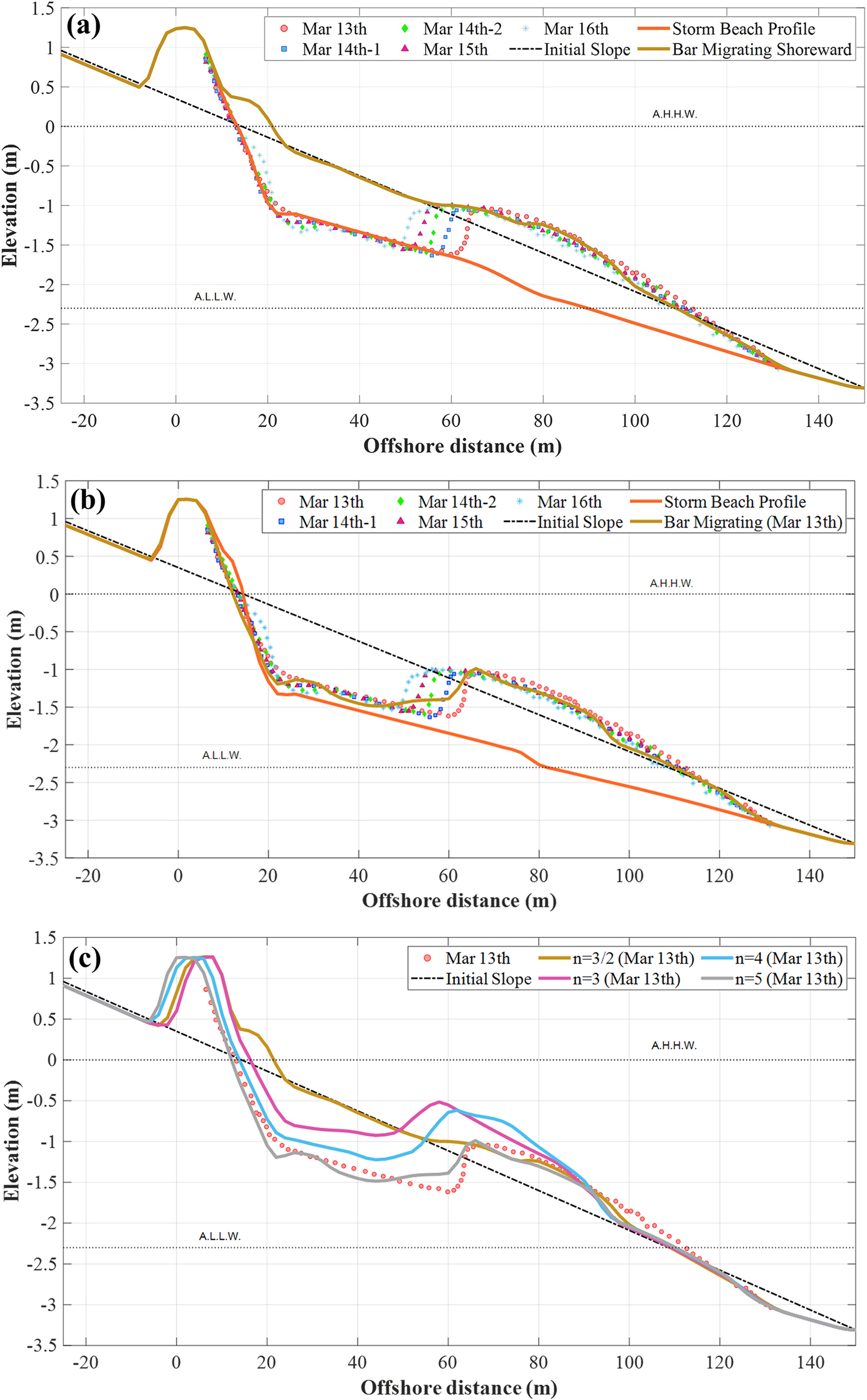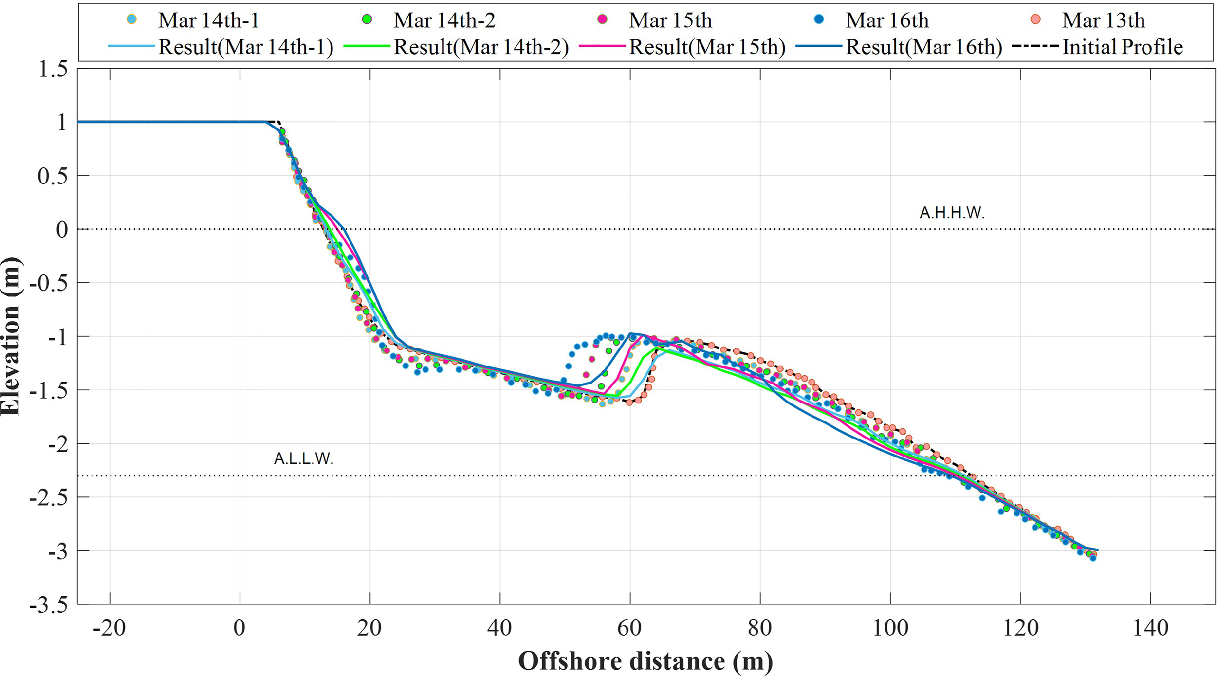Short-term beach profile data observed by van Maanen etĀ al. (2008) were used to investigate the validity of the numerical model results for morphological changes along the beach cross-section from March 13 to 16, 2001. The measured bed elevation profiles show that the rate of onshore migration of the bar crest averaged 3.5 m/day. During the experiment, a beach profile was repeatedly measured up to a depth of 7 m below the mean sea level using an instrumented sea sled (Supplementary FigureĀ 4A, B).