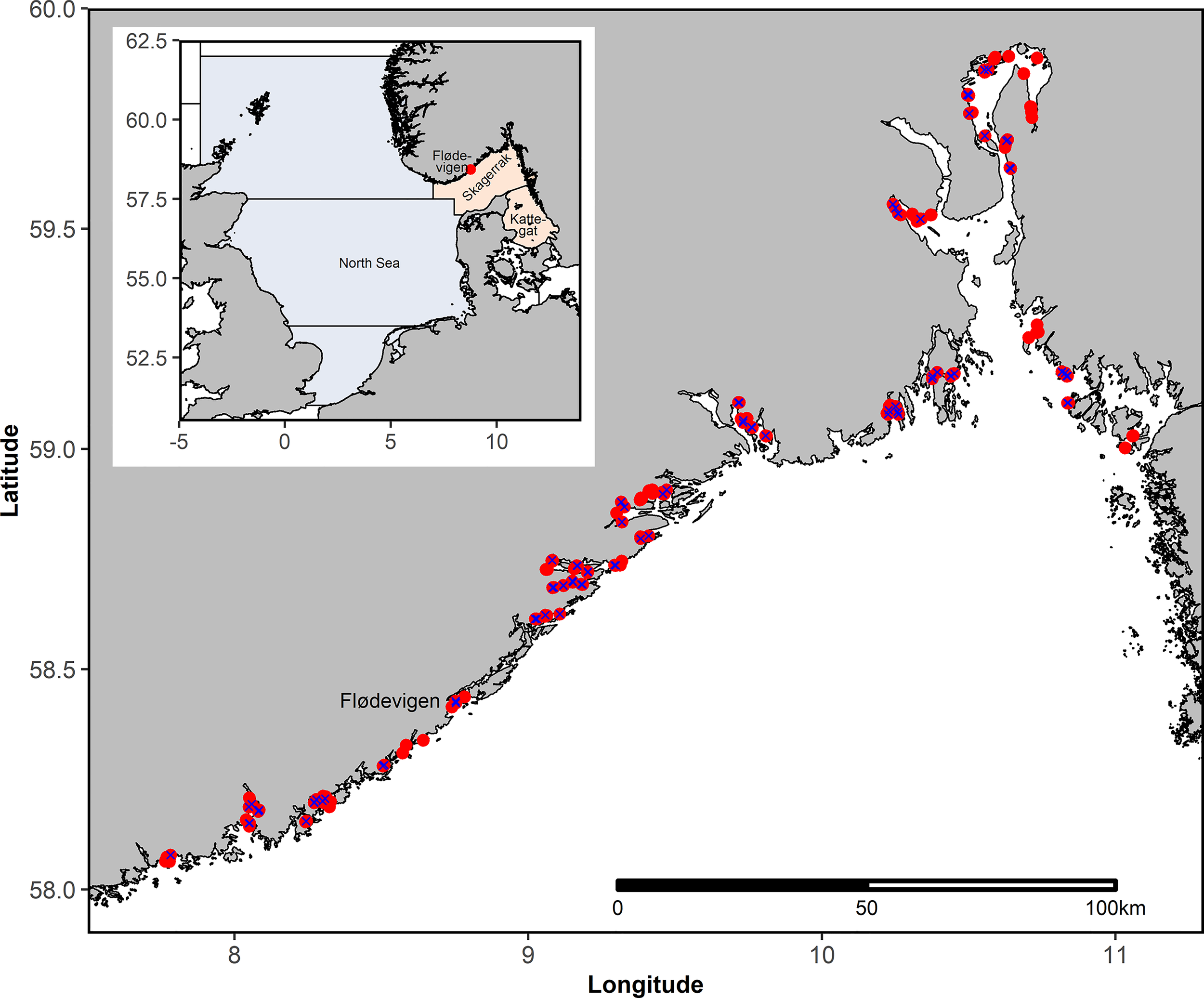 Upper left corner: Overview map showing the North Sea (light blue) and Skagerrak-Kattegat (light red) including the study area. Detailed map including all stations sampled during the annual beach seine survey in September-October between 1919 and 2018. Not all stations are sampled annually. Blue X indicate stations that were sampled more than 95% of the years after 1965.