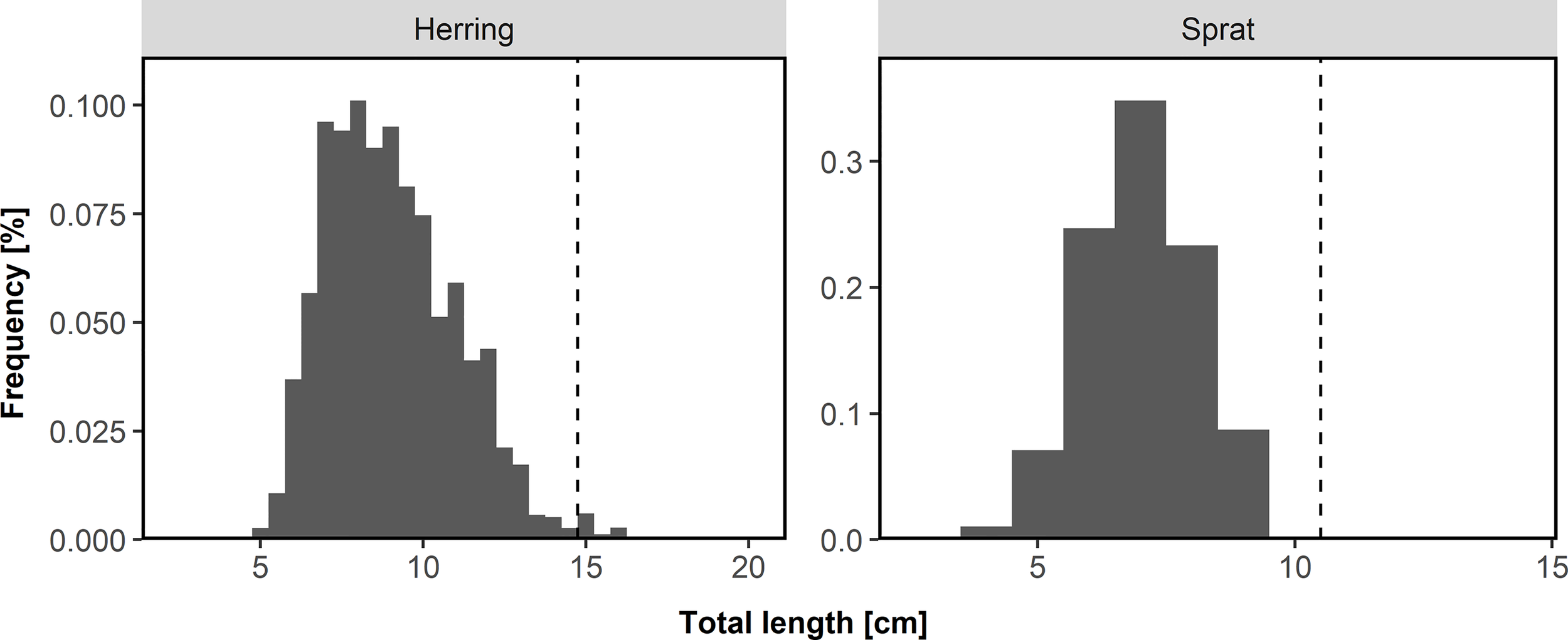 Total length was measured in 0.5 cm and 1 cm intervals for herring and sprat, respectively. Based on the length distribution (Figure 2) of herring (2.5-20 cm) and sprat (3-14 cm) and the very low abundance of herring larger than 14.5 cm (128 of a total of 11,520) and sprat larger than 10 cm (62 of a total of 33,512), we assumed that all herring and sprat represent 0-group fish and did not exclude the larger individuals. Based on otolith readings of individuals in this region and time of the year (not part of the beach seine data) we know that 1-year-old herring and sprat usually are larger than 14.5 cm and 10.0 cm, respectively (Figure S2).