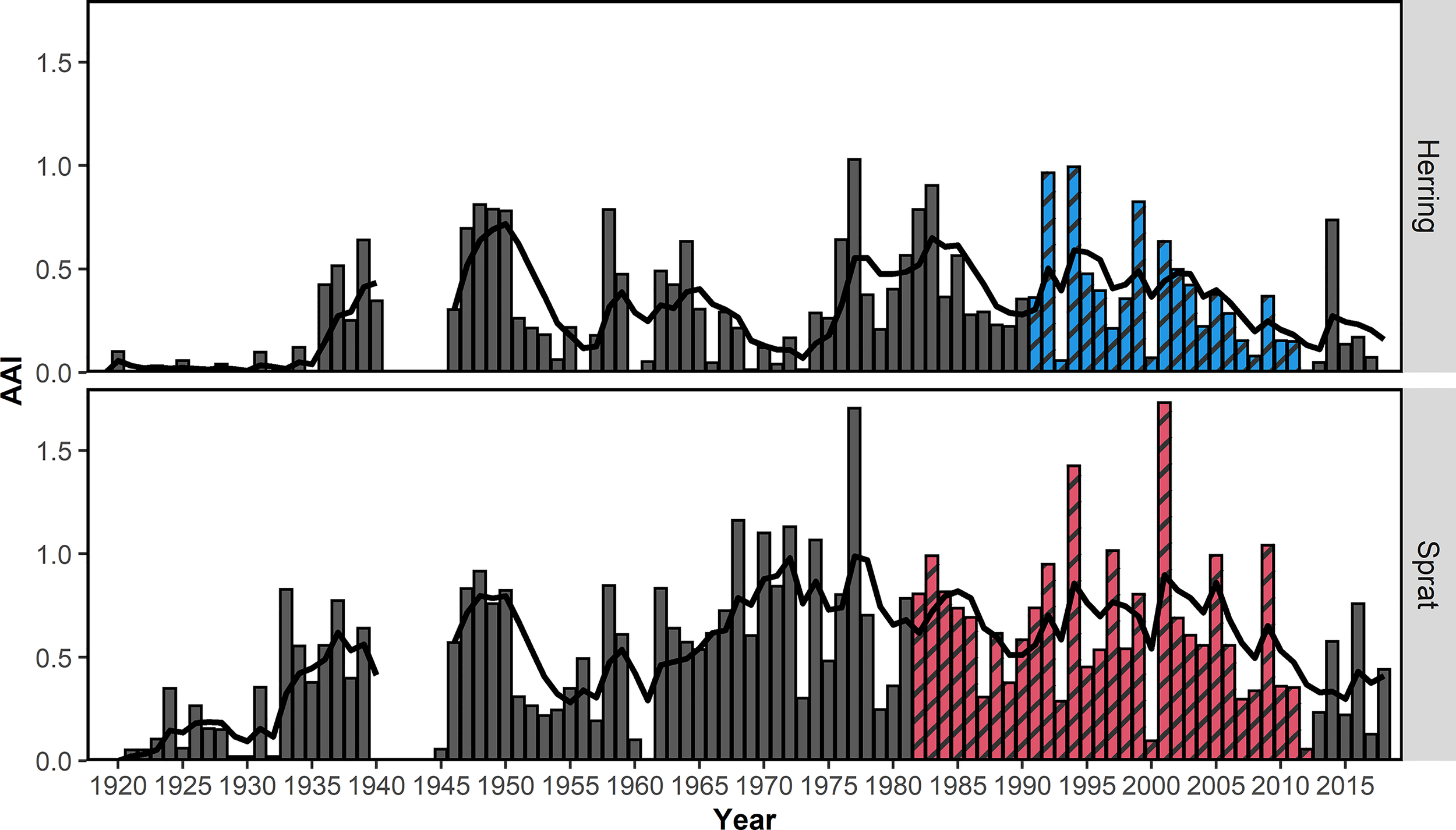 Mean annual abundance index (AAI) of 0-group herring and sprat from the beach seine survey 1919-2018 along the Norwegian Skagerrak coast. Colored and shaded bars (blue for herring, red for sprat) indicate the years which were included in the final model. The black line shows the 5-year-running AAI average. The running average was weighted = (0.8 ^ n) where n represents the difference from the estimated year. No samples were collected during the 2nd World War and no running average was estimated.