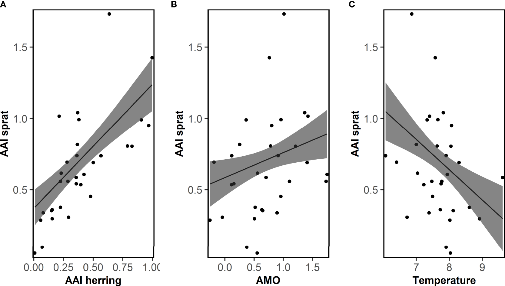 No correlations between AAI of sprat and any ICES indices were significant (Table S3). The correlation analyses between AAI of sprat and other factors demonstrated that very few factors were significant (13 of 459 comparisons, Tables S5, S6), and most of them between the AAI of sprat and the temperature at 75 m depth in Flødevigen. For the Bayesian model approach, the important variables do not reflect the results of the correlation analyses (Table 1). The final model for sprat explaining most of the variation of the AAI included the AAI of herring (positive), AMO index (positive), temperature (negative) and the interaction between the first and second EOF (negative, Figure 5; Table 1 for EOFs). The AAI of sprat was not temporally autocorrelated for the sampling period included in the model.