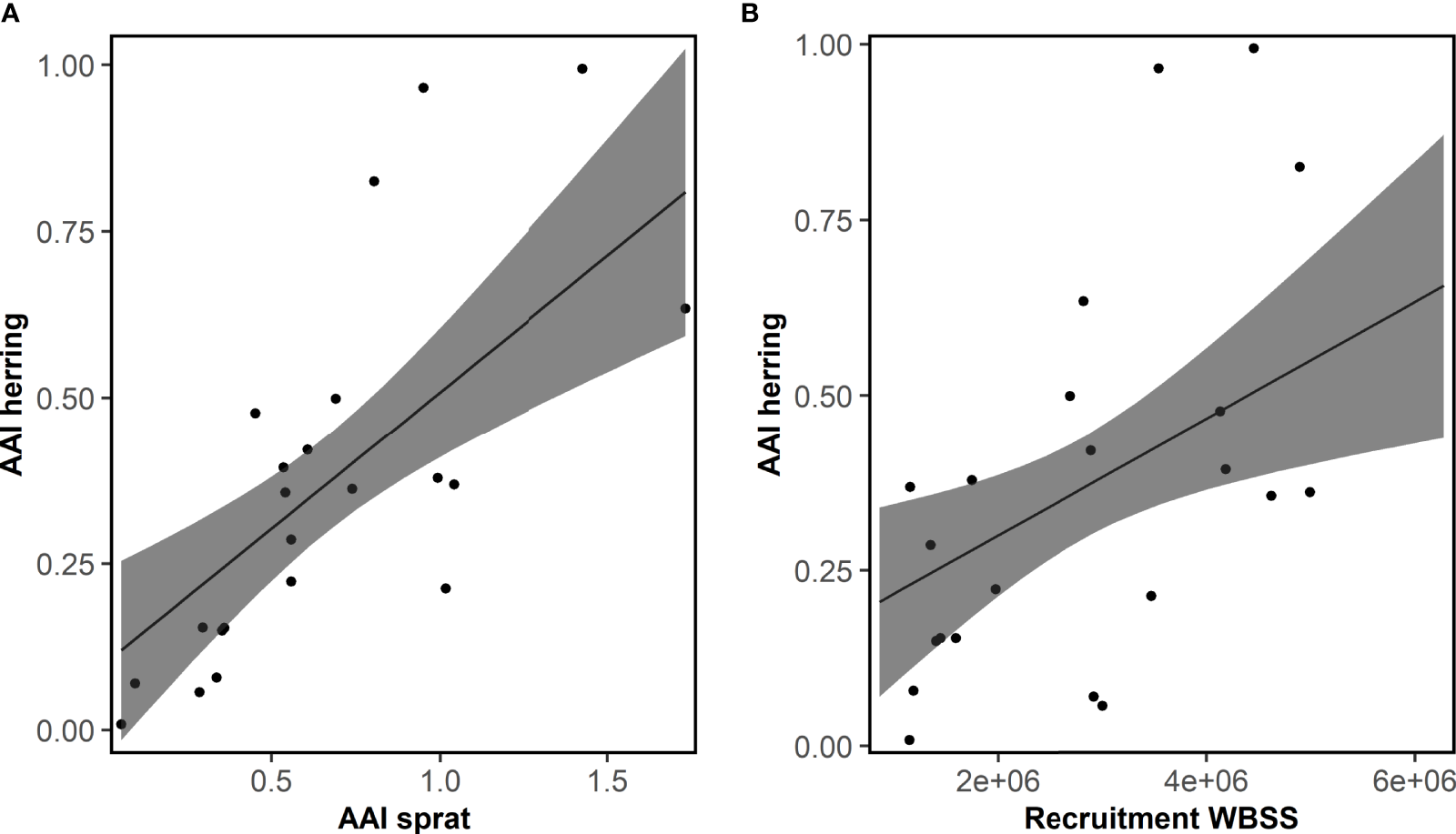 Overall, the AAI of sprat (mean AAI = 0.51) was higher compared to herring (0.28; t-test, p<0.001). AAIs varied inter-annually for sprat and herring (Figure 3). The time series of herring AAI was more stable (lower variance) than for sprat (F-test, ratio of variance = 0.44, p<0.001). However, for both species, the AAIs showed a decreasing trend for at least the last 20 years. The AAIs of sprat and herring were highly positively correlated (r = 0.69, p<0.001, Figure 4). In general, the AAIs showed more variability after 1965 for sprat (F-test, ratio of variance = 0.35, p<0.001) and herring (F-test, ratio of variance = 0.45, p<0.01).
