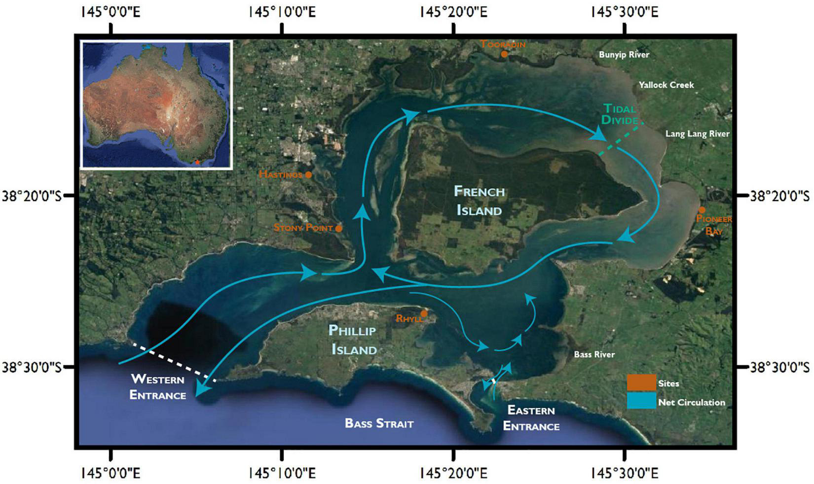 The hydrodynamic complexity of the bay is influenced by the presence of French Island and Phillip Island. Sea water is primarily exchanged with the Bass Strait at the Western Segment entrance, where it is split into the North and East Arms by the presence of French Island (Figure 1).