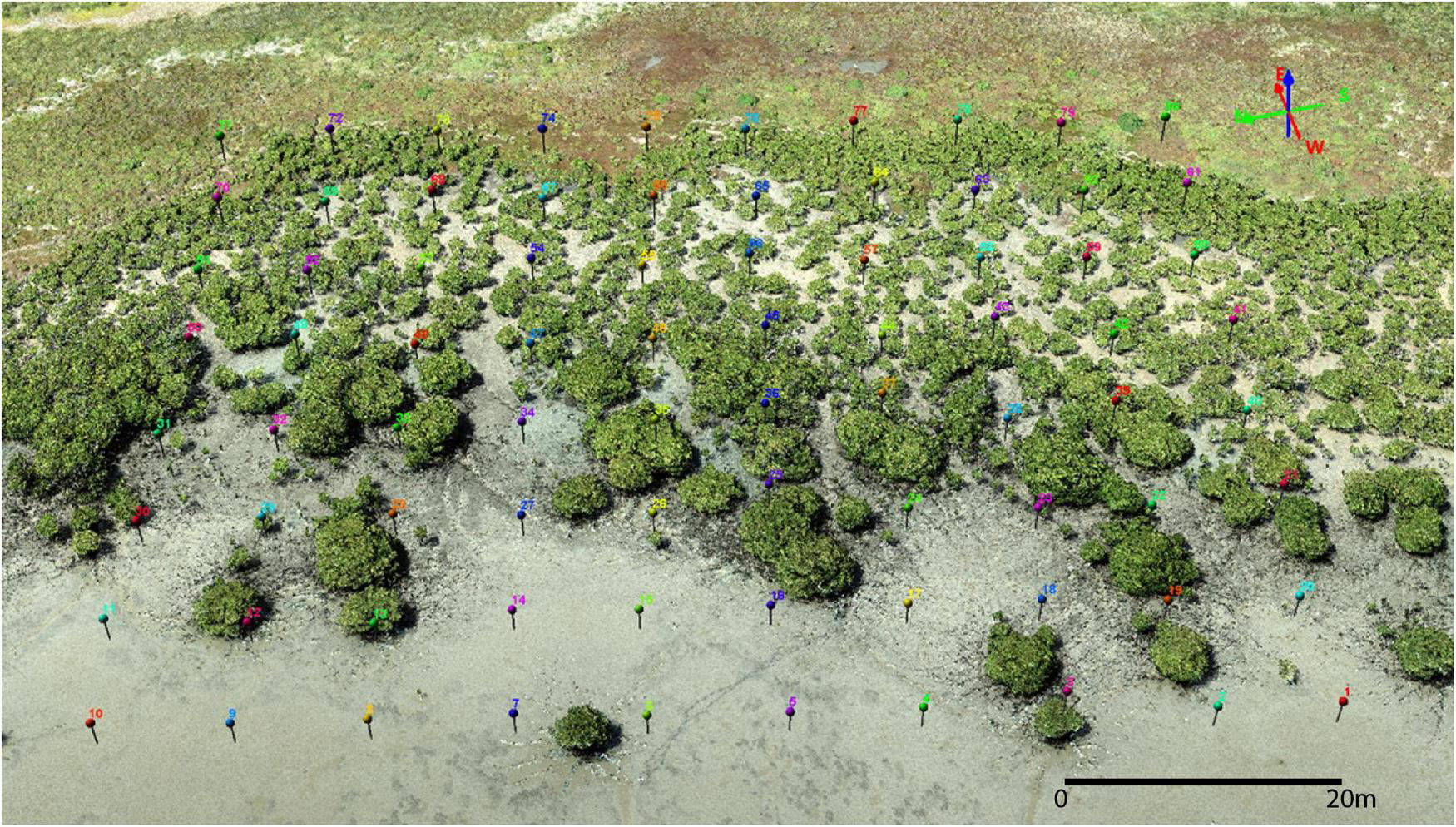 Vegetation studies were conducted on site by measuring the percentage of bare sediment in 1 × 1 m quadrat around each pin. The percentage of bare sediment was calculated as 100 minus the total percentage of coverage of raft, pneumatophores, mangrove stems, cyanobacteria, algae, and salt marsh present.