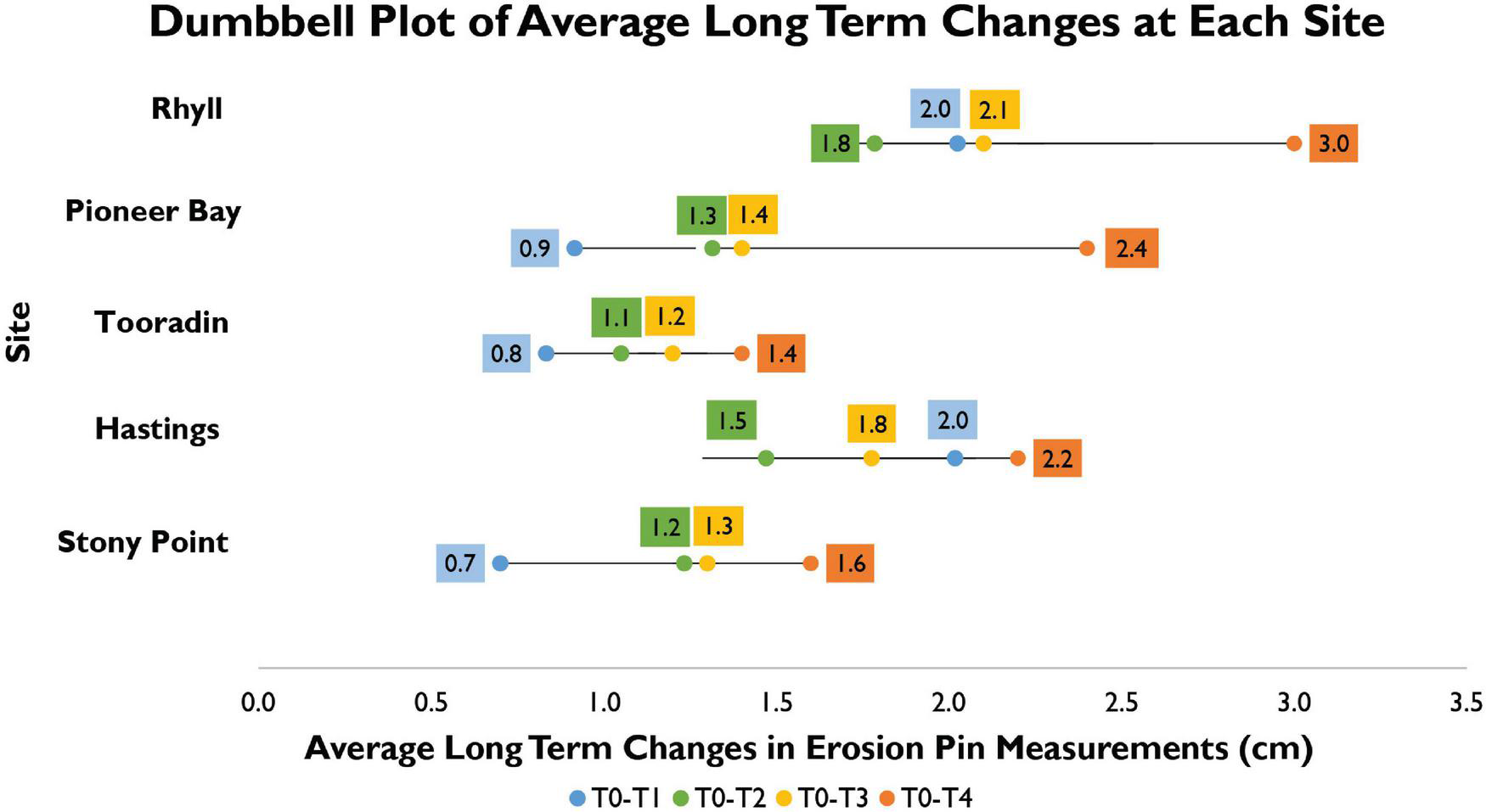 Average site change during measurement period (Figure 4) showed that sites have accreted during every period except during T0-T2, at both Hastings and Rhyll. During T0-T1 average change was 2.0 cm at both Rhyll and Hastings. Reported values at other sites were much lower, with a measured change of 0.9 and 0.7 cm, at Pioneer Bay and Stony Point, respectively. Change at Tooradin was 0.8 cm. However, it should be noted that T0 for Tooradin, is March 2020. During T0-T2 average total change decreased to 1.8 and 1.5 cm, at Rhyll and Hastings, respectively. This shows that during T1-T2 more pins across the two sites recorded erosion, however, the total long-term change was still positive. Accretion was observed at Pioneer Bay with at increase to 1.3 cm, at Tooradin with a total change of 1.1 cm, and an increase to 1.2 cm at Stony Point. Changes during T0-T3 were much more conservative at Pioneer Bay, Tooradin, and Stony Point, with increases to 1.4, 1.2, and 1.3 cm, respectively; compared to a much more substantial jump to 2.1 cm at Rhyll and 1.8 cm Hastings. Between December 2019 and June 2021, Rhyll experienced the largest increase of 3.0 cm, followed by Pioneer Bay with 2.4 cm, Hastings with 2.2 cm, and Stony Point with 1.6 cm. For the period March 2020–June 2021, a change of 1.4 cm was noted at Tooradin.