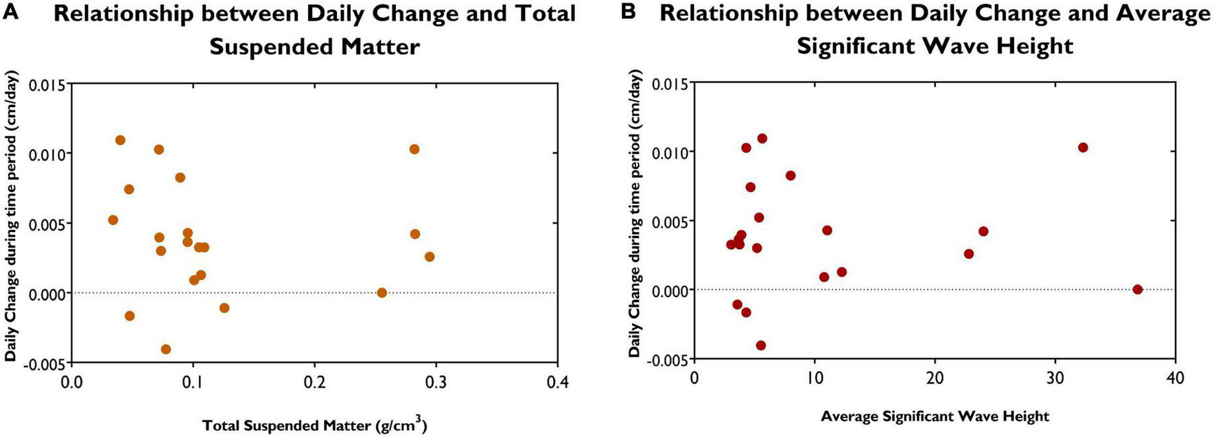 (A) Relationship between daily change between measurement periods and total suspended matter at the various sites. (B) Relationship between daily change between measurement periods and average significant wave height at the various sites.