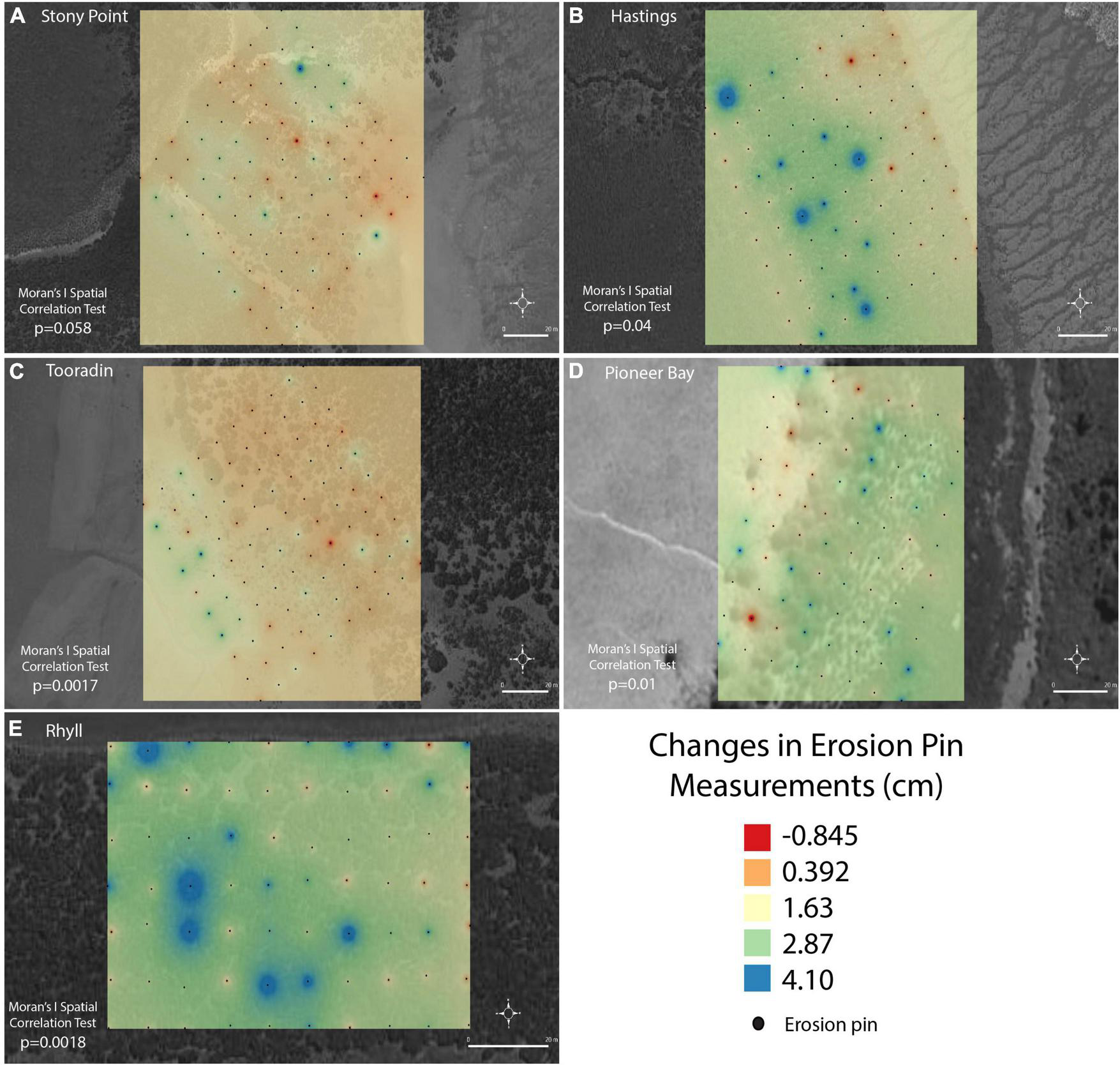 TSM and SWH were treated as site wide parameters used in inter-site and temporal compositions. Smaller scale (intra-site) parameters included distance from MLLW, elevation, and vegetation characteristics (measured as a percentage of bare sediment) for each individual pin. Results of IDW interpolation at Stony Point in Figure 6A, show randomness in the distribution of areas of accretion and erosion across the site. The calculated p-value from Moran’s I test was 0.058 indicating no significant spatial autocorrelation at this scale. At Hastings (Figure 6B), results show a pattern of erosion at the front of the mangrove, more accretion occurring in the middle of the site and erosion or less accretion occurring at the back of the site. There are still areas of erosion occurring within this area, and pins with higher rates of accretion are also randomly spread throughout. Moran’s I test shows significant autocorrelation at Hastings (p = 0.04). At Tooradin (Figure 6C) spatial autocorrelation is present (Moran’s I, p < 0.0017) but is opposite in pattern to that of Hastings, with more areas of higher accretion located at the seaward edge of the mangrove. Areas of accretion and erosion were randomly dispersed throughout the middle and back of the site. Pioneer Bay (Figure 6D) does not show any discernible large-scale pattern of accretion, but erosion and accretion patches occur, with a significant spatial autocorrelation (p = 0.01). Most of the site was accreting. At Rhyll (Figure 6E), similar to Pioneer Bay, accretion and erosion do not follow a larger pattern but some clustering is present (p = 0.00018).