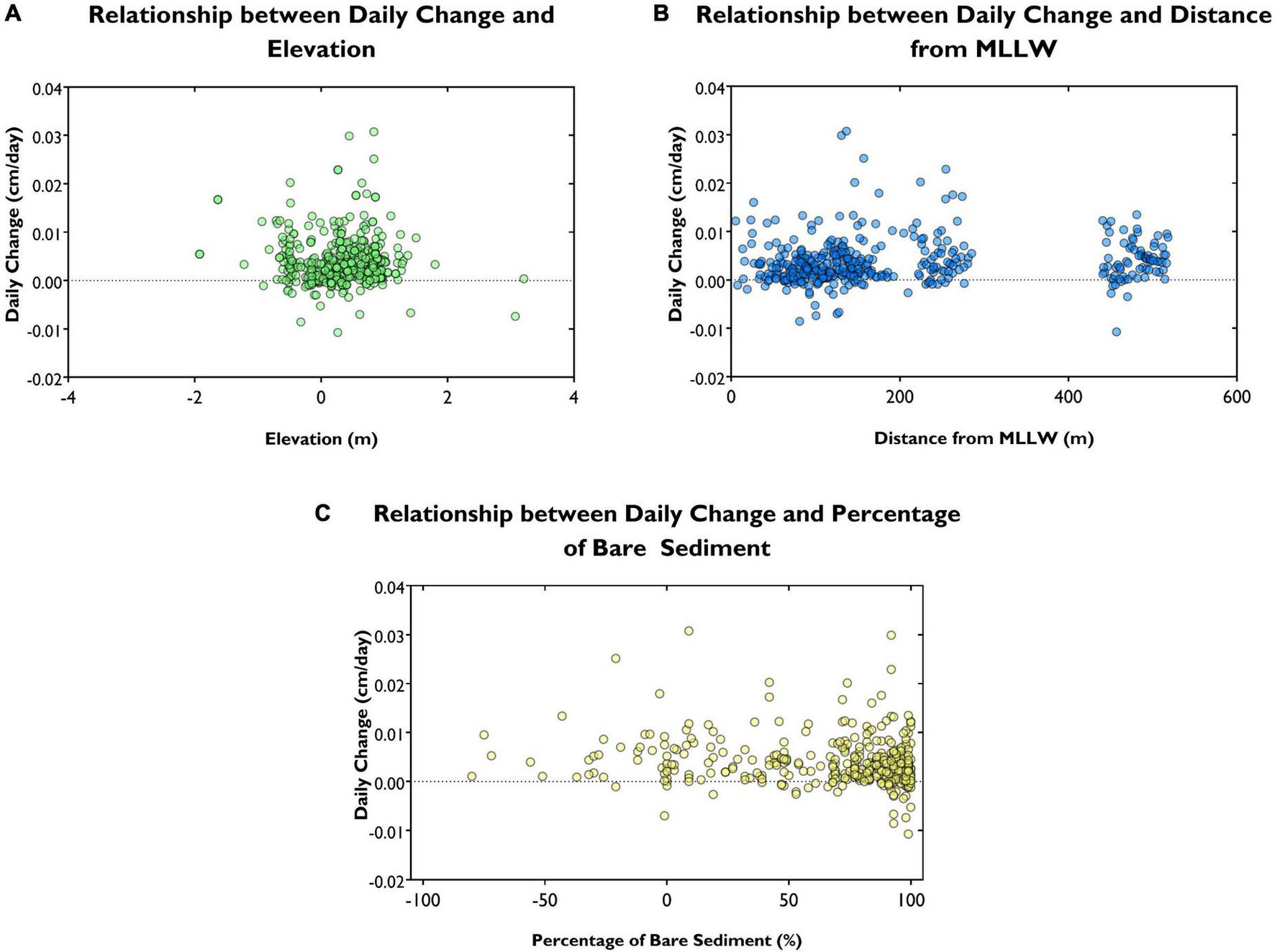 The relationship between long term change and (A) elevation, (B) distance from MLLW and (C) percentage bare sediment.