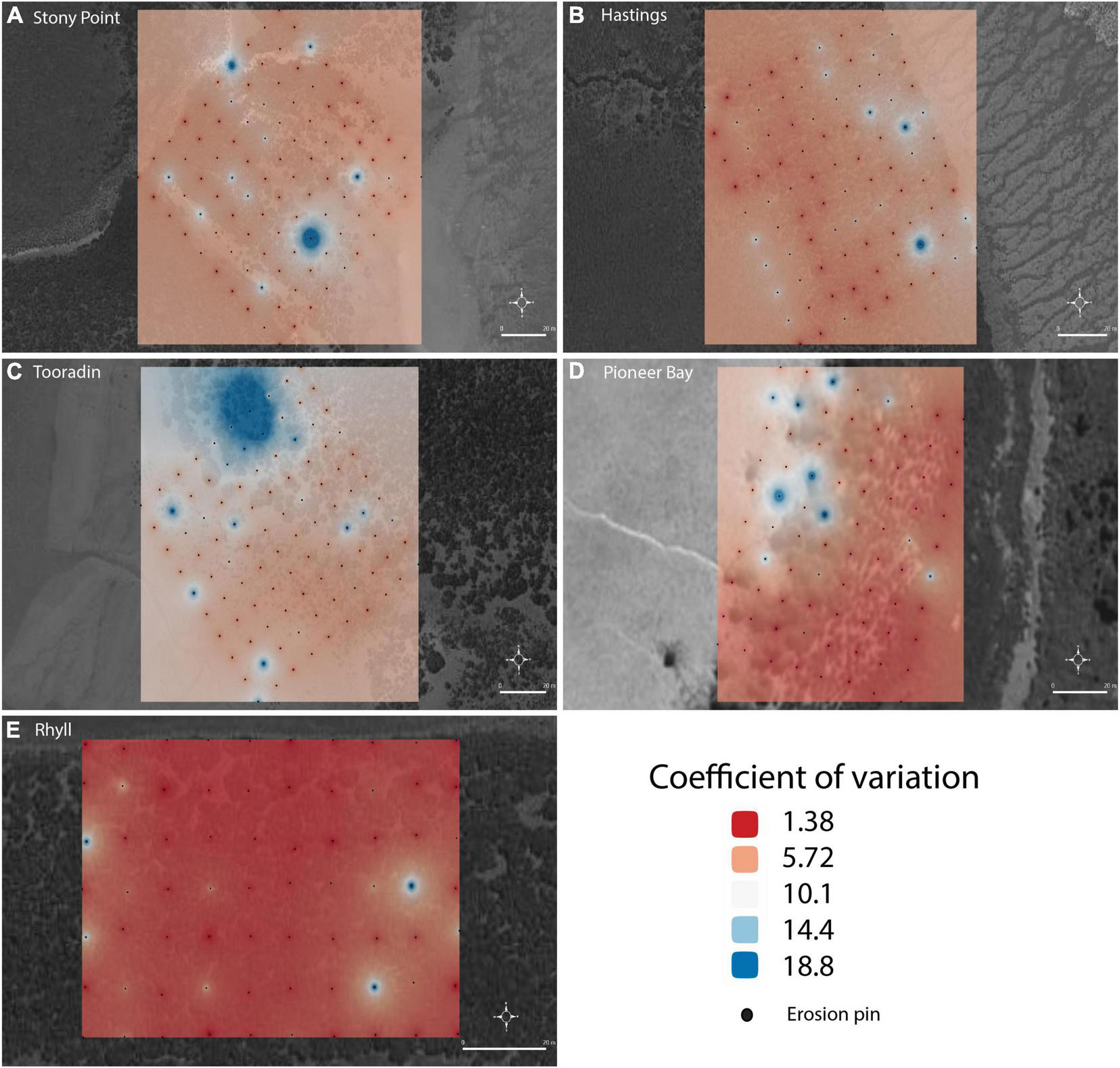 The change in sedimentation at each pin over the measurement periods was assessed using the coefficient of variation (CV) of the long term mean (Figure 8). On average, CV at Rhyll (panel e) is lowest and spatially uniform, indicating the highest rate of stability in the sedimentation process. At other sites such as Stony Point and Hastings, higher CVs occur overall and the instability in sedimentation is distributed in a complex pattern that is not explained by the measured geographical parameters of distance from MLLW, vegetation density or elevation. At Pioneer Bay CV is low within the forest, but exceptionally high on the mudflat. This pattern was not seen at other sites. On average, temporal variation between measurements is highest at Tooradin, particularly to the north of the site.
