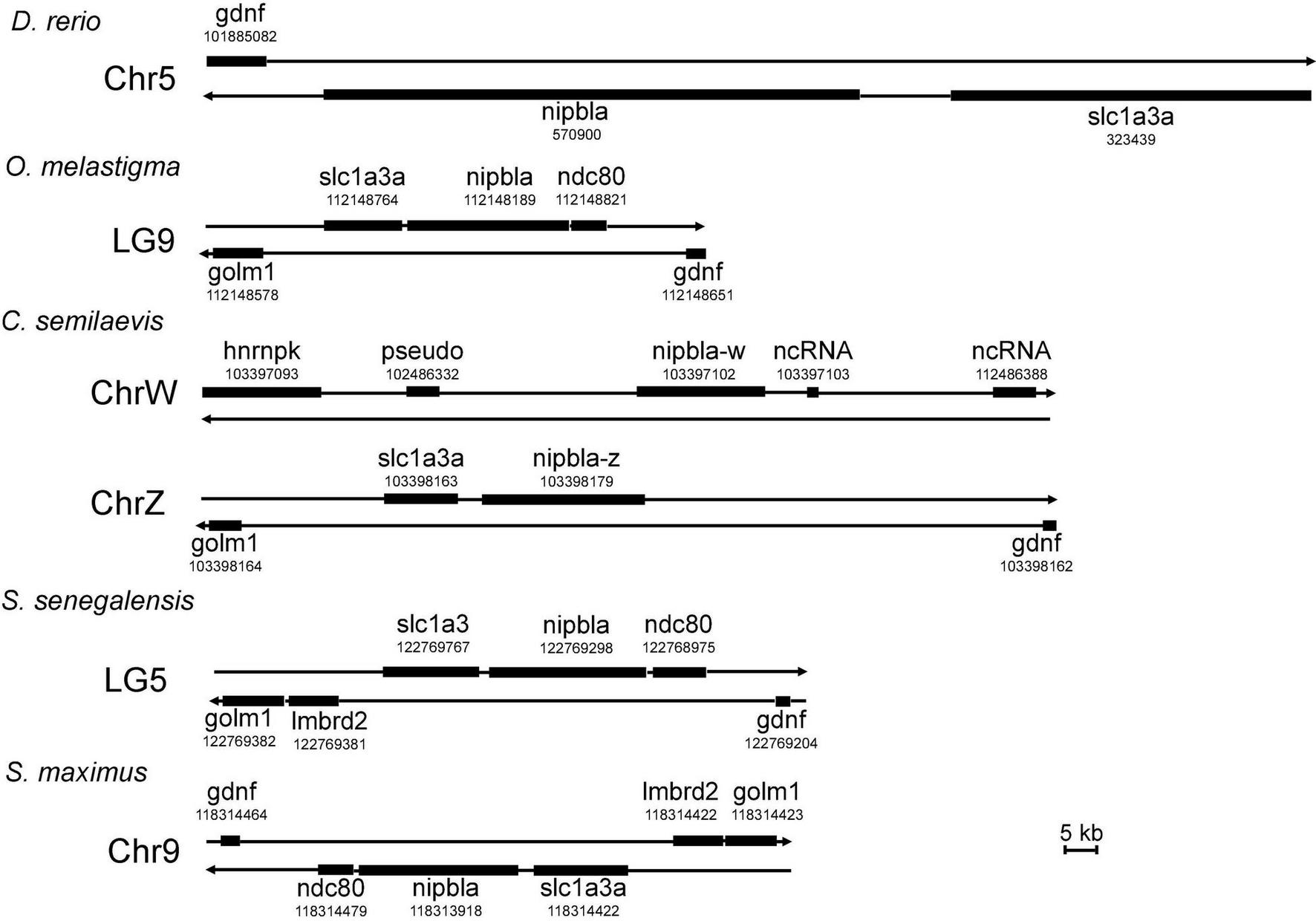 The chromosome location information of nipbla-w and nipbla-z. Danio rerio chromosome 5_7,986,080–8,171,694, Oryzias melastigma LG9_15,171,132–15,252,085, Cynoglossus semilaevis chromosome w_8,015,650-8,133,838, C. semilaevis chromosome z_16,746,071-16,882,207, Solea senegalensis LG5_13,731,413–13,824,383, and Scophthalmus maximus chromosome 9_15,599,751–15,691,435 were illustrated with nipbla and other genes location. hnrnpk, heterogeneous nuclear ribonucleoprotein K; golm1, golgi membrane protein 1; slc1a3a, solute carrier family 1 member 3a; gdnf, glial cell line-derived neurotrophic factor; ndc80, NDC80 kinetochore complex component; ncRNA, non-coding RNA.