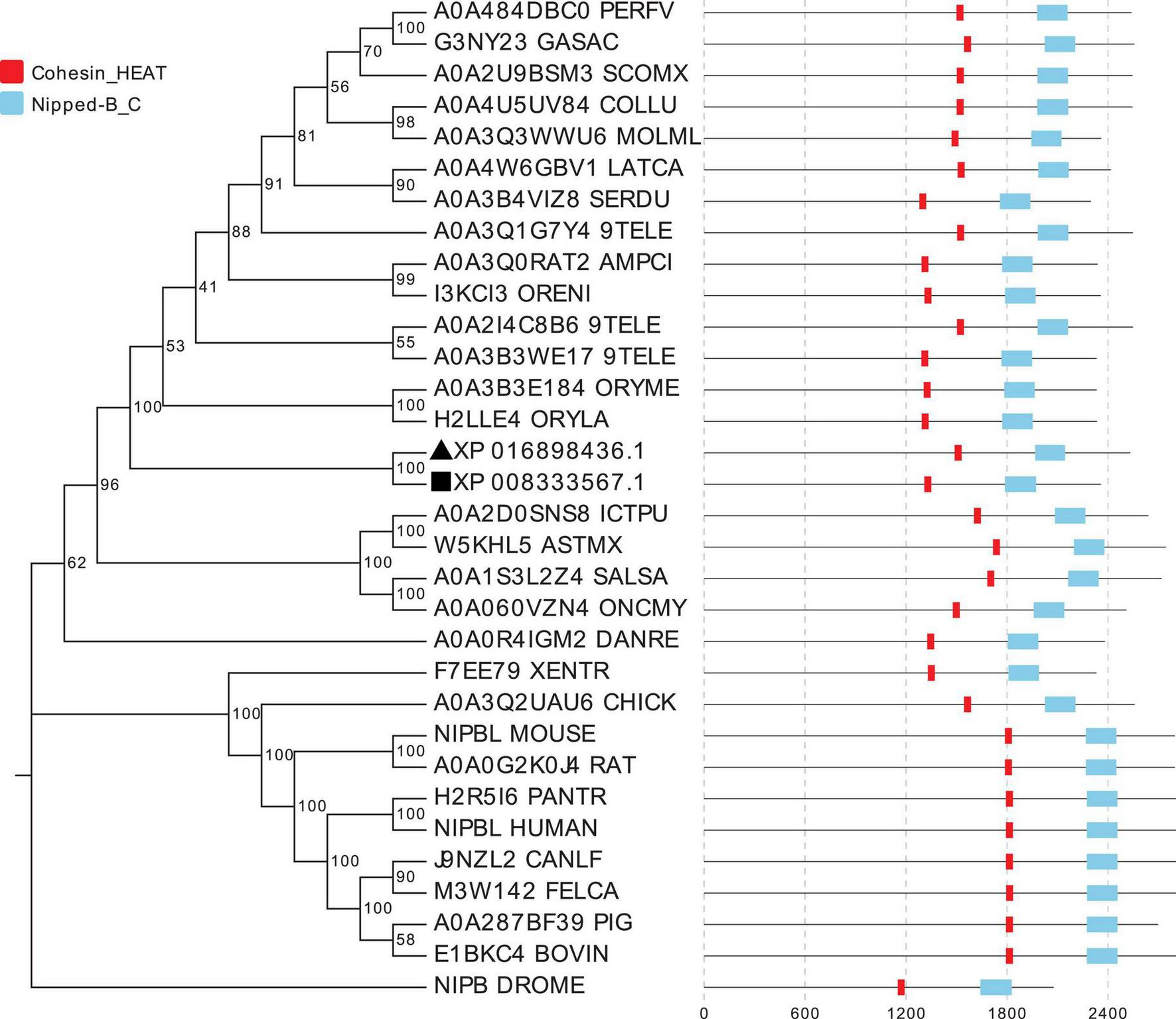 The evolutionary relationships of nipbl proteins in different species. A total of 32 nipbl proteins were used for the phylogenetic tree construction using the neighbor-joining method in MEGA 7.0. The percentage of replicate trees in which the associated taxa clustered together in the bootstrap test (1,000 replicates) is shown next to the branches. Notably, 32 nipbl proteins are listed as follows: A0A4W6GBV1_LATCA (Lates calcarifer, barramundi perch), A0A3B4VIZ8_SERDU (Seriola dumerili, greater amberjack), A0A3Q0RAT2_AMPCI (Amphilophus citrinellus, midas cichlid), I3KCI3_ORENI (Oreochromis niloticus, Nile tilapia), A0A3Q1G7Y4_9TELE (Acanthochromis polyacanthus, spiny chromis), A0A4U5UV84_COLLU (Collichthys lucidus, big head croaker), A0A3Q3WWU6_MOLML (Mola mola, ocean sunfish), A0A2U9BSM3_SCOMX (S. maximus, turbot), A0A484DBC0_PERFV (Perca flavescens, American yellow perch), G3NY23_GASAC (Gasterosteus aculeatus, three-spined stickleback), XP_008333567.1 (nipbla-w in C. semilaevis), XP_016898436.1 (nipbla-z in C. semilaevis), A0A2I4C8B6_9TELE (Austrofundulus limnaeus, annual killifish), H2LLE4_ORYLA (Oryzias latipes, medaka), A0A3B3WE17_9TELE (Poecilia mexicana, Atlantic molly), A0A2D0SNS8_ICTPU (Ictalurus punctatus, Channel catfish), A0A1S3L2Z4_SALSA (Salmo salar, Atlantic salmon), NIPBL_MOUSE (Mus musculus, mouse), J9NZL2_CANLF (Canis lupus familiaris, Dog), M3W142_FELCA (Felis catus, cat), H2R5I6_PANTR (Pan troglodytes, chimpanzee), NIPBL_HUMAN (Homo sapiens, human), A0A060VZN4_ONCMY (Oncorhynchus mykiss, rainbow trout), A0A3Q2UAU6_CHICK (Gallus gallus, chicken), F7EE79_XENTR (Xenopus tropicalis, western clawed frog), W5KHL5_ASTMX (Astyanax mexicanus, blind cave fish), A0A287BF39_PIG (Sus scrofa, Pig), E1BKC4_BOVIN (Bos taurus, bovine), A0A0G2K0J4_RAT (Rattus norvegicus, rat), NIPB_DROME (Drosophila melanogaster, fruit fly), A0A0R4IGM2_DANRE (D. rerio, zebrafish), and A0A3B3E184_ORYME (O. melastigma, marine medaka). Black square and triangle represent nipbla-w and nipbla-z proteins, respectively.