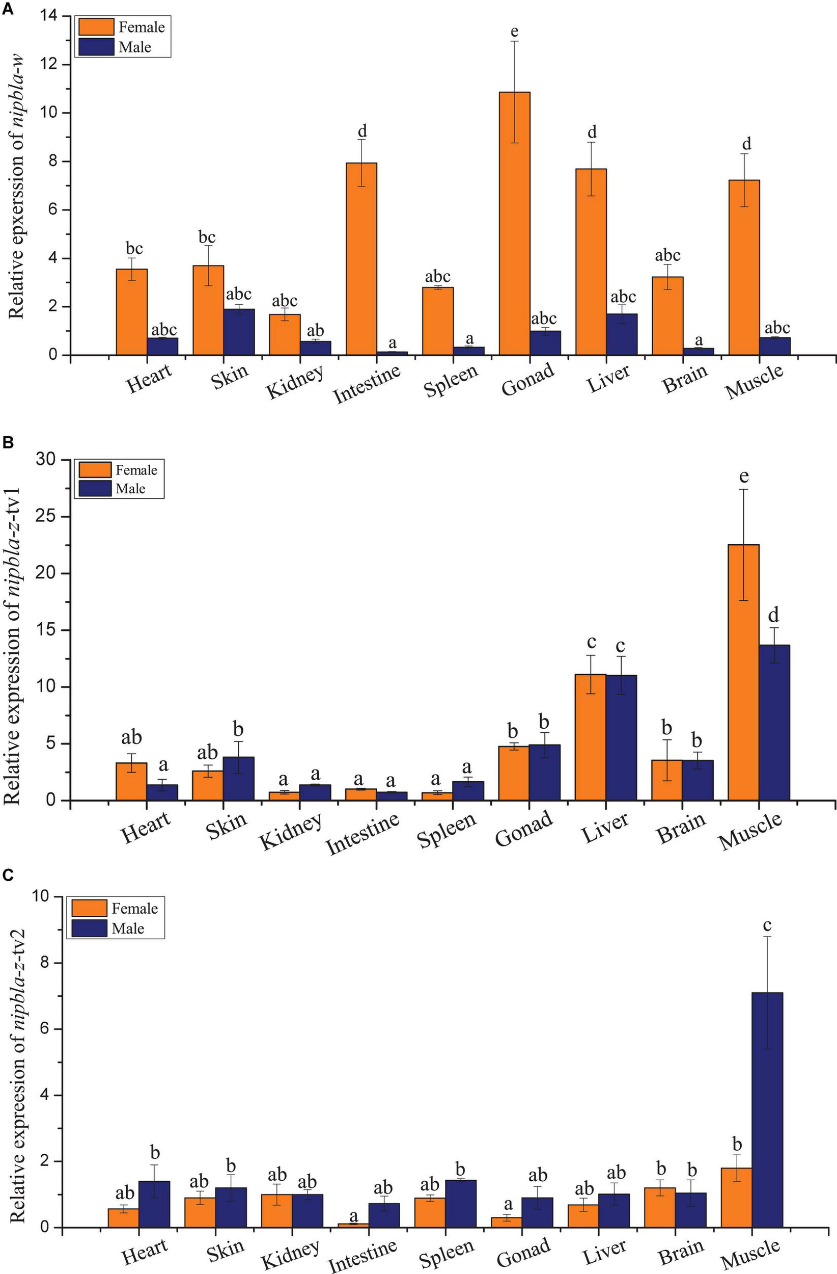 The relative expression patterns of nipbla-w and nipbla-z in female and male tissues. The relative repression levels of nipbla-w and nipbla-z in brain, gonad, spleen, heart, intestine, kidney, liver, muscle, skin, and spleen and of female and male individuals are shown in parts (A–C), respectively. Different letters represent significant differences.