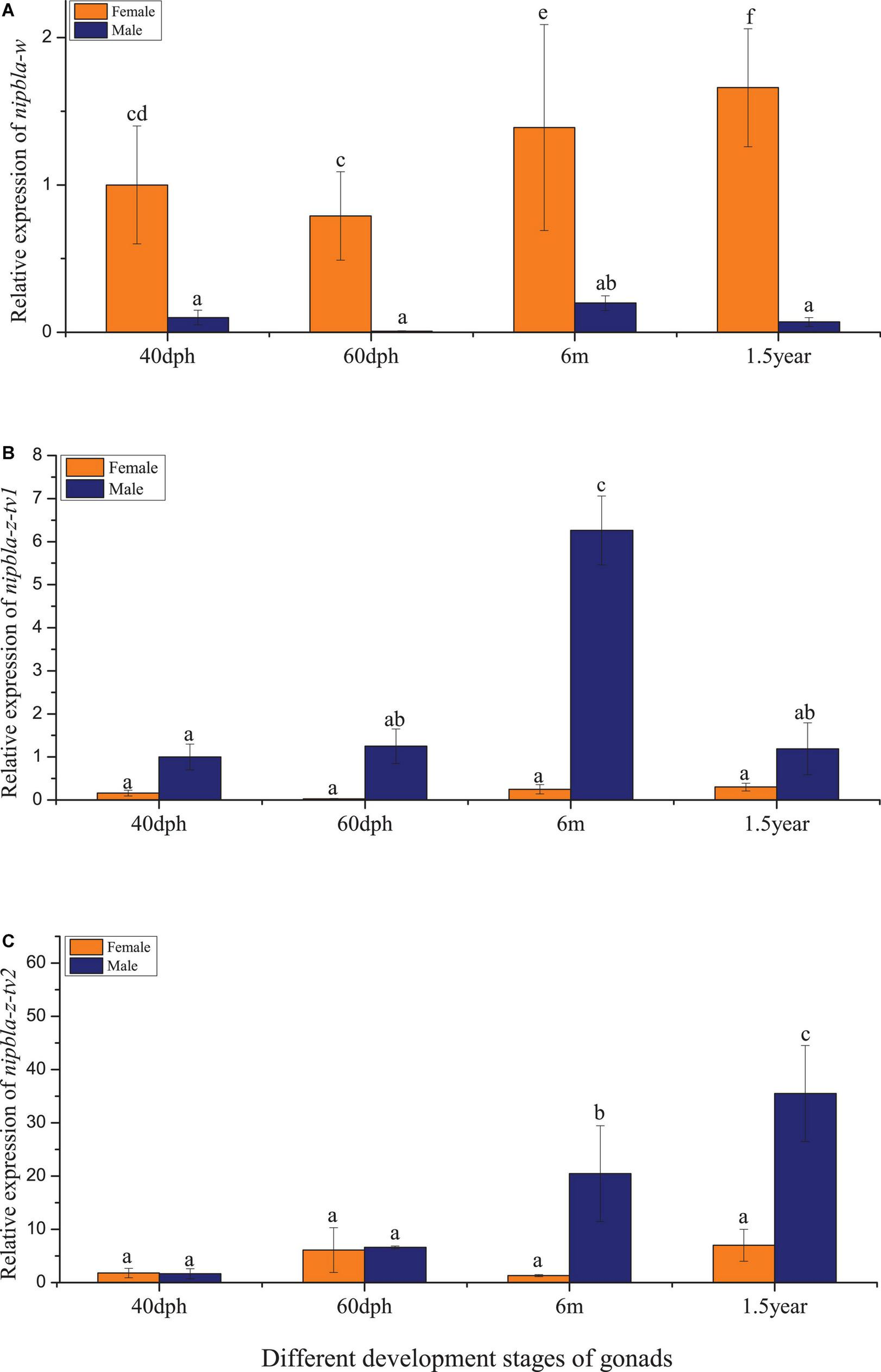 The relative expression patterns of nipbla-w and nipbla-z in female and male individuals in the development of gonads. (A) The nipbla-w transcription in the gonads at different developmental stages. (B) The nipbla-z-tv1 transcription in the gonads at different developmental stages. (C) The nipbla-z-tv2 transcription in the gonads at different developmental stages. Different letters represent significant differences.