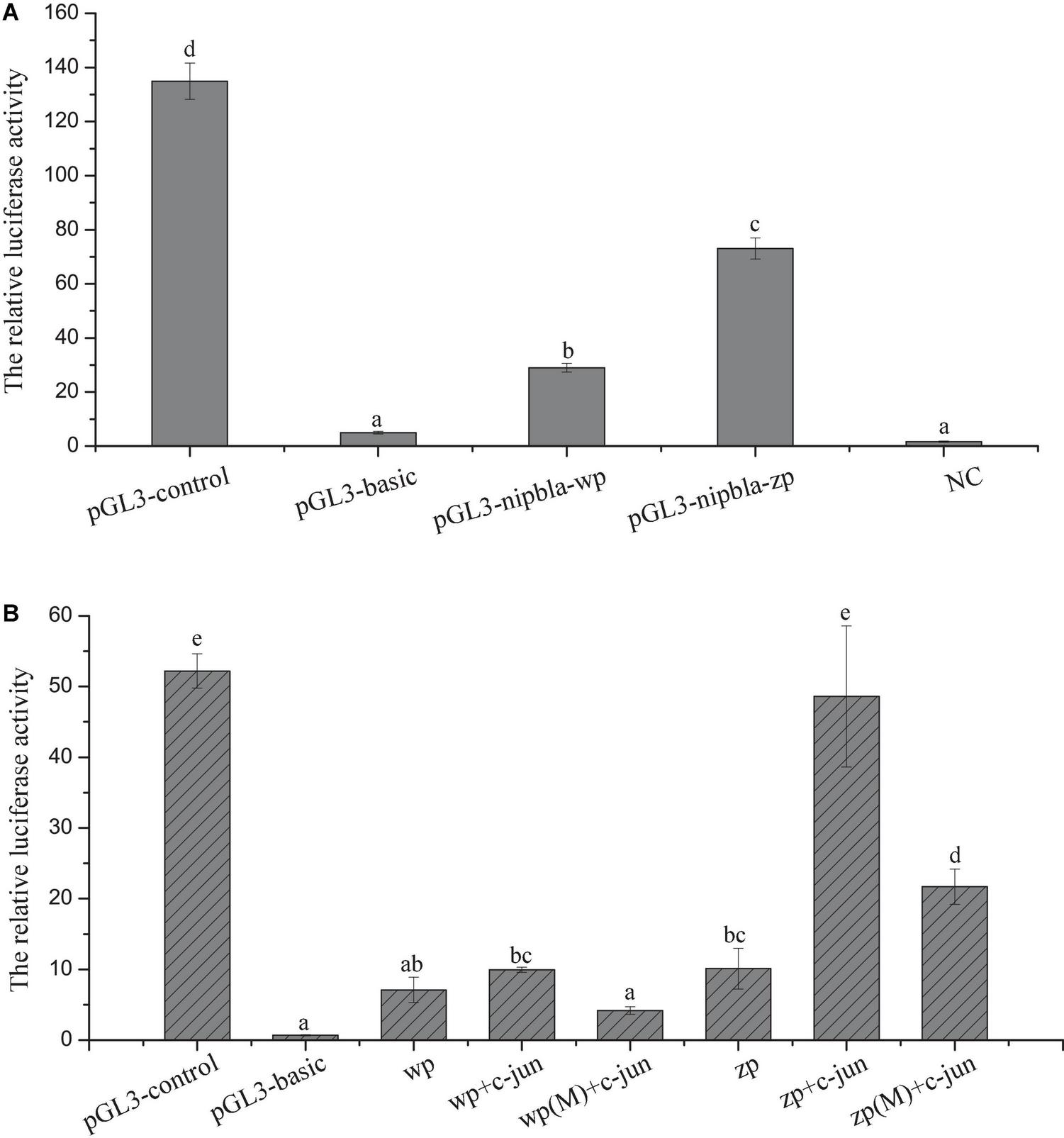 The analysis of nipbla-w and nipbla-z transcriptional activity and the effect of c-Jun on transcriptional activity of nipbla-w and nipbla-z. (A) The analysis of nipbla-w and nipbla-z transcriptional activity. (B) The effect of c-Jun on transcriptional activity of nipbla-w and nipbla-z promoter. Different letters represent significant differences.