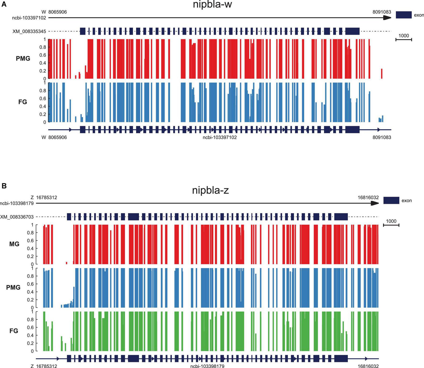 The analysis of approximately 2 kb up- and downstream flanking regions of the nipbla-w and nipbla-z genomic sequence from the female ovary, male and pseudo-male testes are shown in Figure 6. Interestingly, as shown, there was a clear difference in the gene body, especially located at first exon region, which exhibited difference between female and pseudo-male individuals in nipbla-w and also exhibited difference between female, male, and pseudo-male individuals in nipbla-z.