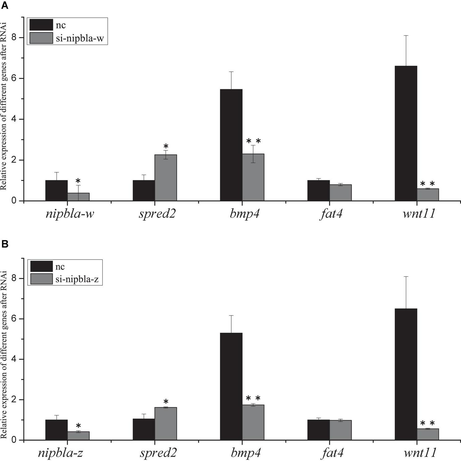 The nipbla small-interfering RNAs (i.e., si-nipbla-w and si-nipbla-z in Table 1) were designed and synthesized by RiboBio Co., Ltd. (Guangzhou, Guangdong Province, China). Even more, a non-specific siRNA negative was executed as a control [negative control (NC)] during the cell transfection process. Three replicates of si-nipbla-w, si-nipbla-z, and NC groups were conducted at 20 nM. After transfection for 48 h, the total RNA was extracted from the cells, and cDNA was synthesized according to the abovementioned methods. The relative expression levels of the genes related to growths, such as Bone Morphogenetic Protein 4 (bmp4), Wnt Family Member 11 (wnt11), and Sprouty Related EVH1 Domain Containing 2 (spred2), and FAT Atypical Cadherin 4 (fat4) were evaluated by qPCR.