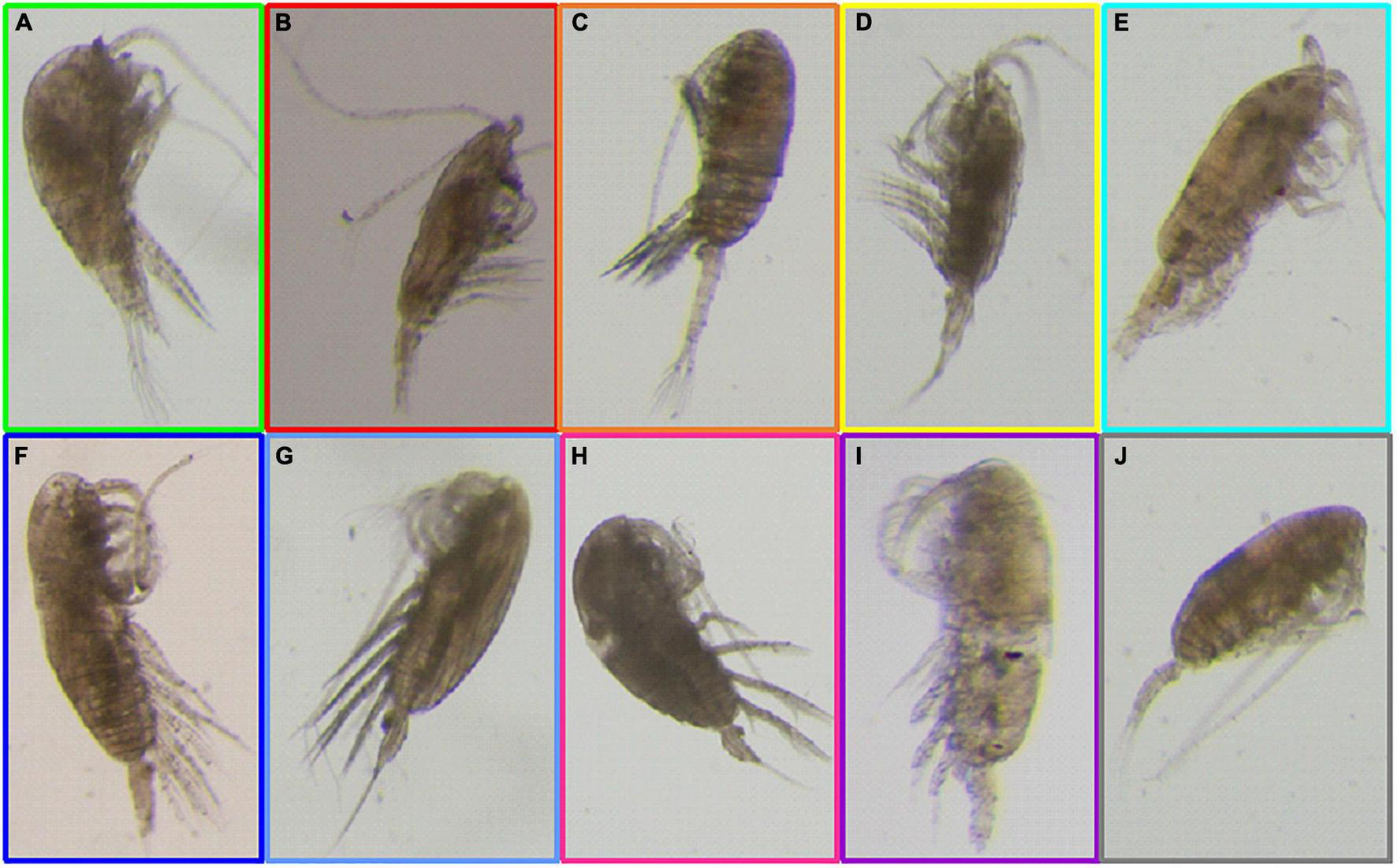 HD-images of 10 calanoid copepod species studied in the Gulf of Naples: (A)Temora stylifera;(B)Acartia clausi;(C)Pseudodiaptomus marinus;(D)Centropages typicus;(E)Pleuromamma gracilis;(F)Calanus helgolandicus;(G)Nannocalanus minor;(H)Euchirella rostrata;(I)Clausocalanus parapergens;(J)Ctenocalanus vanus. The total body length of the specimens showed in this Figure are reported in the Table 1.