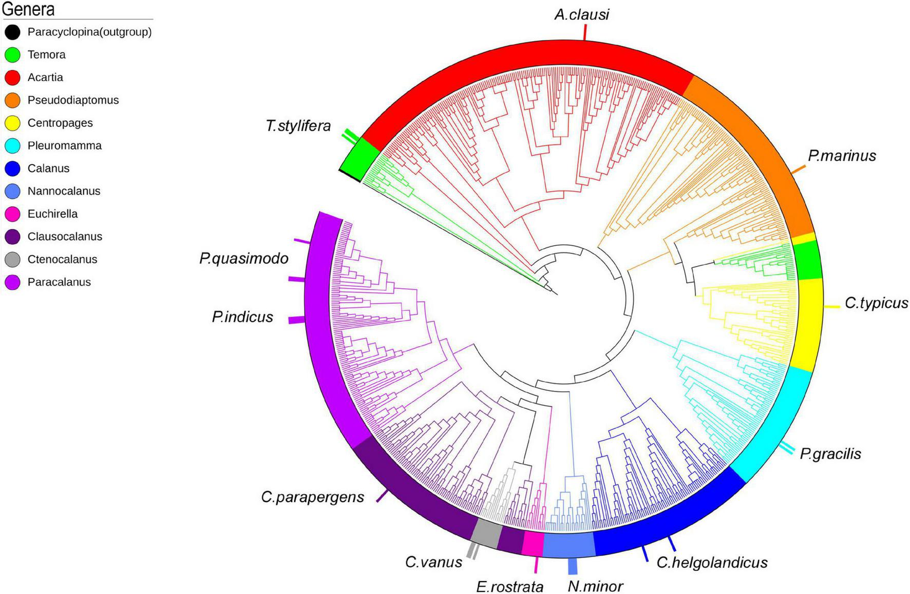 A total of 4,400 COI reference sequences belonging to the 11 analyzed calanoid genera were downloaded from BOLD to reconstruct the phylogenetic relationships of the investigated species. Collapse of identical sequences reduced the dataset to 2,490 unique sequences. Filtered sequences generated a final dataset including 717 COI entries. For molecular identification of copepod species by tree placement, a Maximum Likelihood tree was generated using the GTR model (Figure 4), including 743 sequences (717 reference sequences from BOLD, 25 sequences generated in this study, and 1 outgroup). The single marker COI succeeded in identifying the query sequence at the genus and species levels and provided support to discriminate 11 genera with high support (87–98%) (Temora, Acartia, Pseudodiaptomus, Centropages, Pleuromamma, Calanus, Nannocalanus, Euchirella, Clausocalanus, Ctenocalanus, and Paracalanus) (Figure 4 and Supplementary Figure 1).