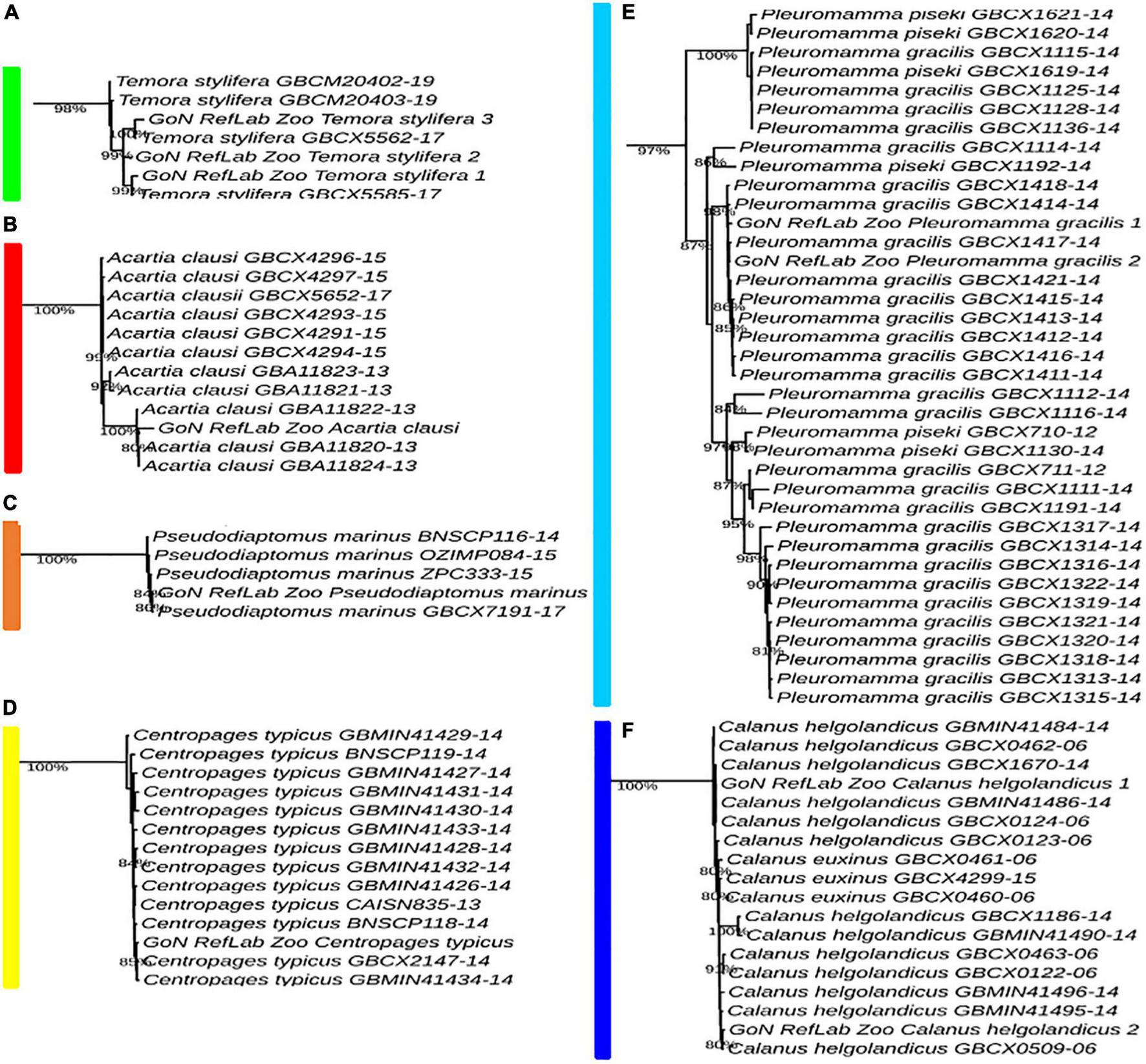 Molecular identification based on ML tree. Portions from the full tree are illustrated: (A)Temora stylifera;(B)Acartia clausi; (C)Pseudodiaptomus marinus; (D)Centropages typicus; (E)Pleuromamma gracilis; (F)Calanus helgolandicus. Full tree available in Supplementary Figure 1.