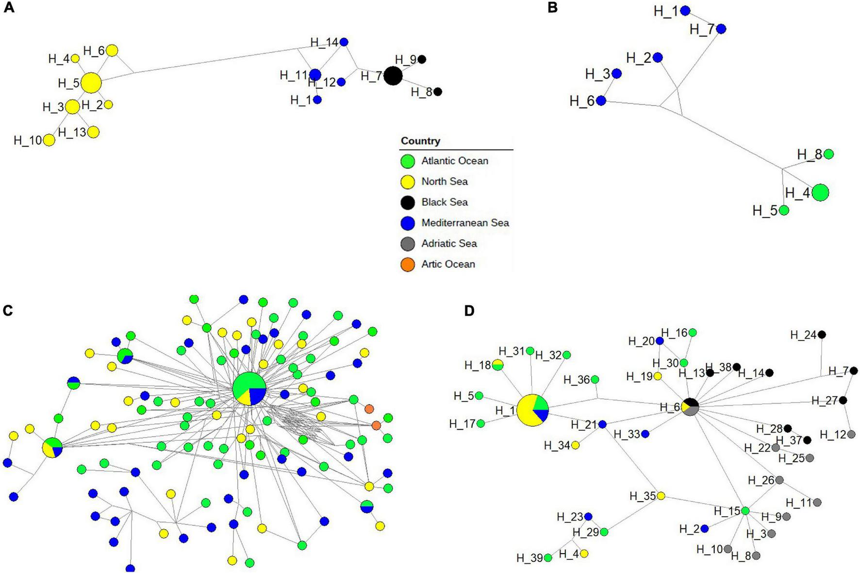 Phylogenetic networks showed different patterns in the four dominant neritic calanoid copepods at LTER-MC (A. clausi, C. typicus, P. parvus, and T. stylifera), as well as in the offshore species C. helgolandicus (Figures 7A–D). Both in A. clausi (Figure 7A) and T. stylifera (Figure 7B), haplotypes showed a clear separation based on the geographical origin of the specimens, and reticulate structures were absent. In A. clausi, seven haplotypes from the North Sea (H_2-H_6, H_10, and H_13) were separated from four haplotypes from the Mediterranean Sea including our sequences (H_1, H_11, H_12, and H_14) and three from the Black Sea (H_7-H_9). A similar pattern was found in T. stylifera with a clear separation between the three haplotypes from the Atlantic Ocean (H_4, H_5, and H_8) and the five ones from the Mediterranean Sea (H_1-H_3, H_6, and H7). The C. typicus network (Figure 7C) generated a dominant haplotype including different areas connected with several minor haplotypes without any clear geographical signal. The C. helgolandicus phylogeographic network (Figure 7D) showed the presence of a cosmopolitan haplotype (H_1), including individuals from all the geographic areas except the Adriatic Sea: ten from the North Sea, three from the Atlantic Ocean and two from the Mediterranean Sea (one of which isolated from the Gulf of Naples). This haplotype was surrounded by several other unique haplotypes, mainly from the North Sea. Specimens of C. helgolandicus from the Adriatic Sea (H_3, H_8-H_11, H_22, H_25, and H_26) and from the Black Sea (H_37) were not included in the H_1 haplotype, but were found as single haplotypes weakly connected with the other geographical locations. The second most abundant haplotype of the network (H_6) was shared between C. helgolandicus and C. euxinus species, and included two specimens of C. helgolandicus (one from the North Sea and one from the Adriatic Sea) and three specimens of C. euxinus (two from the Black Sea and one from the Adriatic Sea). All other specimens of C. euxinus (H_7, H_13, H_14, H_24, H_27, H_28, and H_38) and C. helgolandicus (H_37) from the Black Sea did not show links with other geographical areas, apart from one haplotype from the Adriatic Sea (H_12). The network for P. parvus revealed an intricate structure owing to the occurrence of a species complex, and consequently to the absence of a commonly agreed morphologically based standard reference (Supplementary Figure 3).