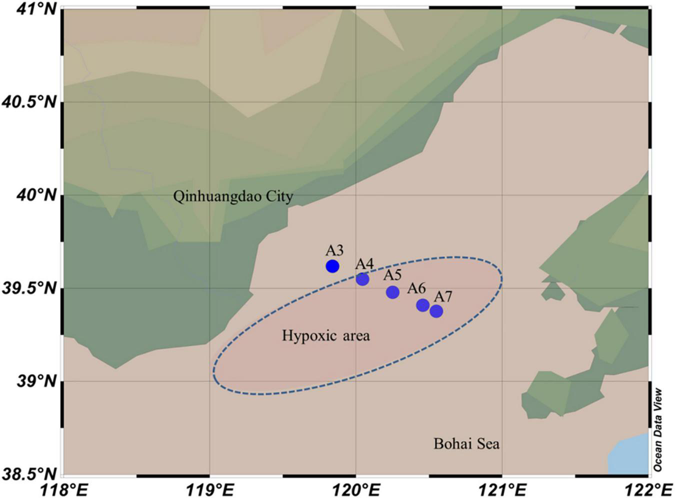Map showing the sampling sites in Bohai Sea along inshore—offshore transect. The blue dash line oval showing the reported hypoxic area.