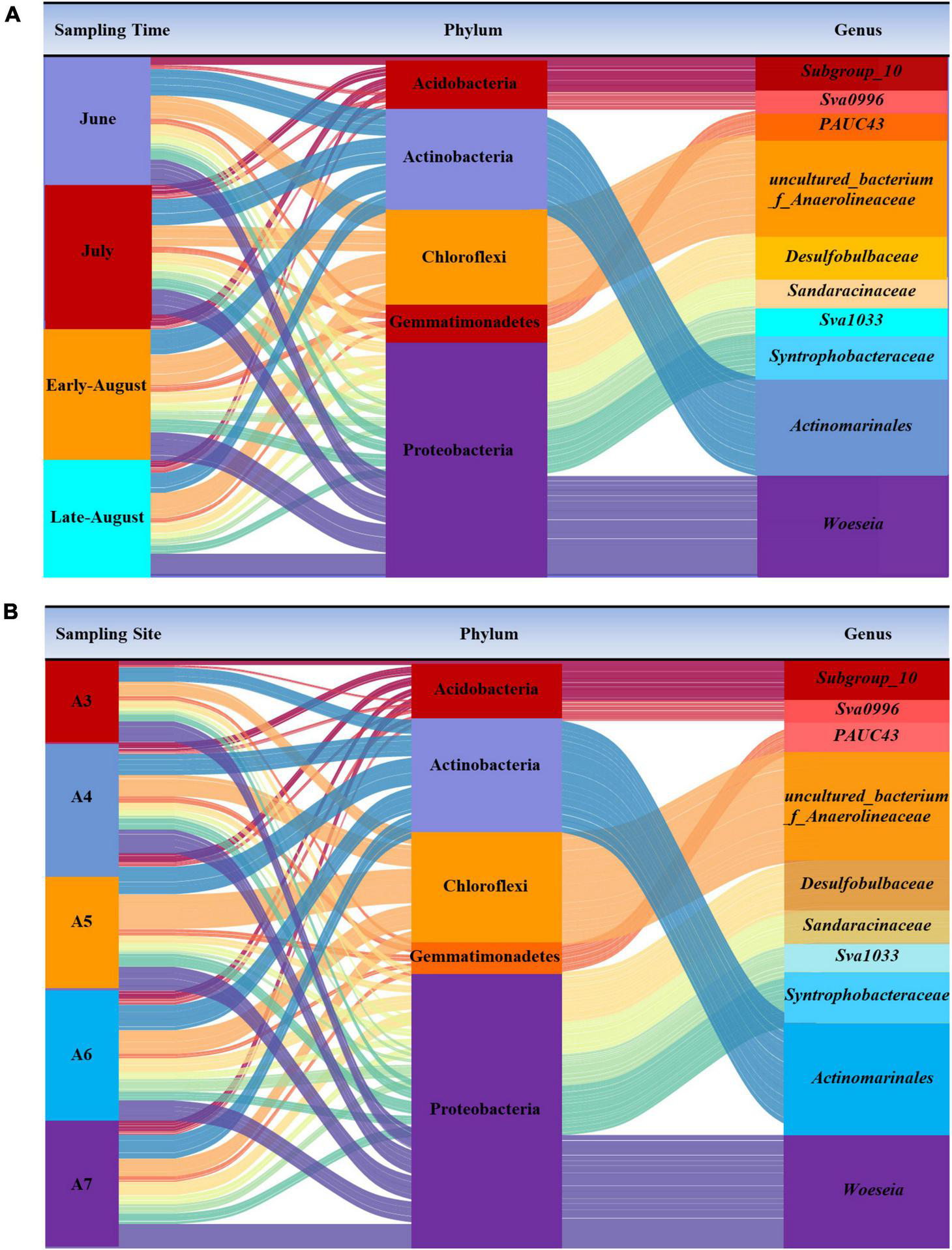 The community composition of dominant bacteria at phylum and genus level from each sampling time (A) and site (B).