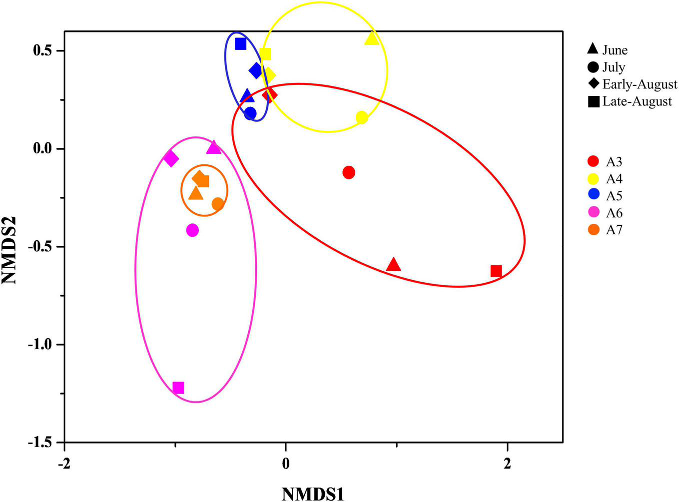 The spatial distribution of bacteria was evaluated by non-metric multidimensional scaling (NMDS) analysis based on the binary-jaccard method (Figure 3). Samples from the same sites were clustered together, while samples from different sampling time were separately distributed. Among which, samples from A6 and A7 overlapped with each other, which suggested the high similarity of community composition of bacteria in A6 and A7.