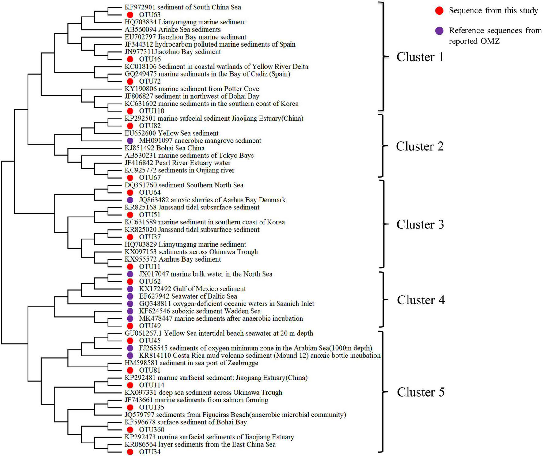 Aiming to figure out the origin or the phylogenetic distance of bacteria in Bohai Sea sediment, with special focus on the oxygen depletion sites, the phylogenetic analysis was further performed with dominant sequences (top 18 OTUs) and the reference sequences from GenBank by constructing Neighbor-joining tree. Results revealed that bacteria from Bohai Sea oxygen depletion sites had a diverse phylogenetic relationship with bacteria in typical OMZs, such as the Yangtze River estuary, the Gulf of Mexico, the Arabian Sea, the west coast of the Indian Ocean, the North Indian Ocean, and the Bay of Bengal (Figure 6). Moreover, novel hypoxic-adapted species in the sediments of Bohai Sea were also predicted, such as OTU64, OTU82, which were grouped with reported OMZ species but formed a unique clade in the phylogenetic tree. Anaerolineae and SAR11, represented by OTU45, OTU62, respectively, clustered together with most of the sequences from OMZs. As mentioned above, Anaerolineae was strictly anaerobic, which was a typical and specific bacterium in the Bohai Sea oxygen depletion area. While for SAR11 members, which were group of aerobic Alphaproteobacteria, had the ability to assimilate nitrogen-rich organic compounds by allocating surrounding resources when experiences nitrogen stress (Smith et al., 2013). Therefore, this group of bacteria could function as a specific object for research on nitrogen cycle in hypoxic zone. Moreover, due to the close geographic distance, a high degree of kinship of Bohai Sea sediment with the sediment sequences in Jiaozhou Bay, the Yellow Sea and the South China Sea were revealed from the phylogenetic tree.