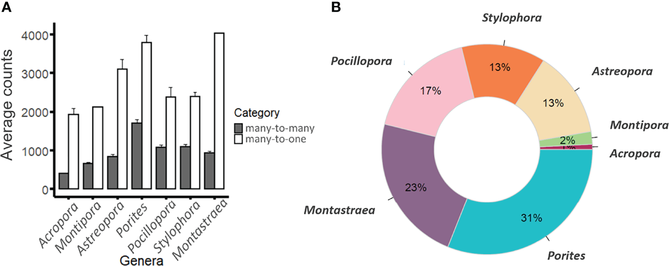 Figure 1 Classification of genomic protein sets. (A) Average counts of genes assigned to many-to-many (grey bars) or many-to-one (white bars) orthogroups across the coral genera examined (sensu Voolstra et al., 2017). Note that most genera consisted of one species except for Montipora (2), Pocillopora (2) species, and Acropora (16). Error bars denote standard error. (B) Average proportions of species-specific orthogroups within each genus.