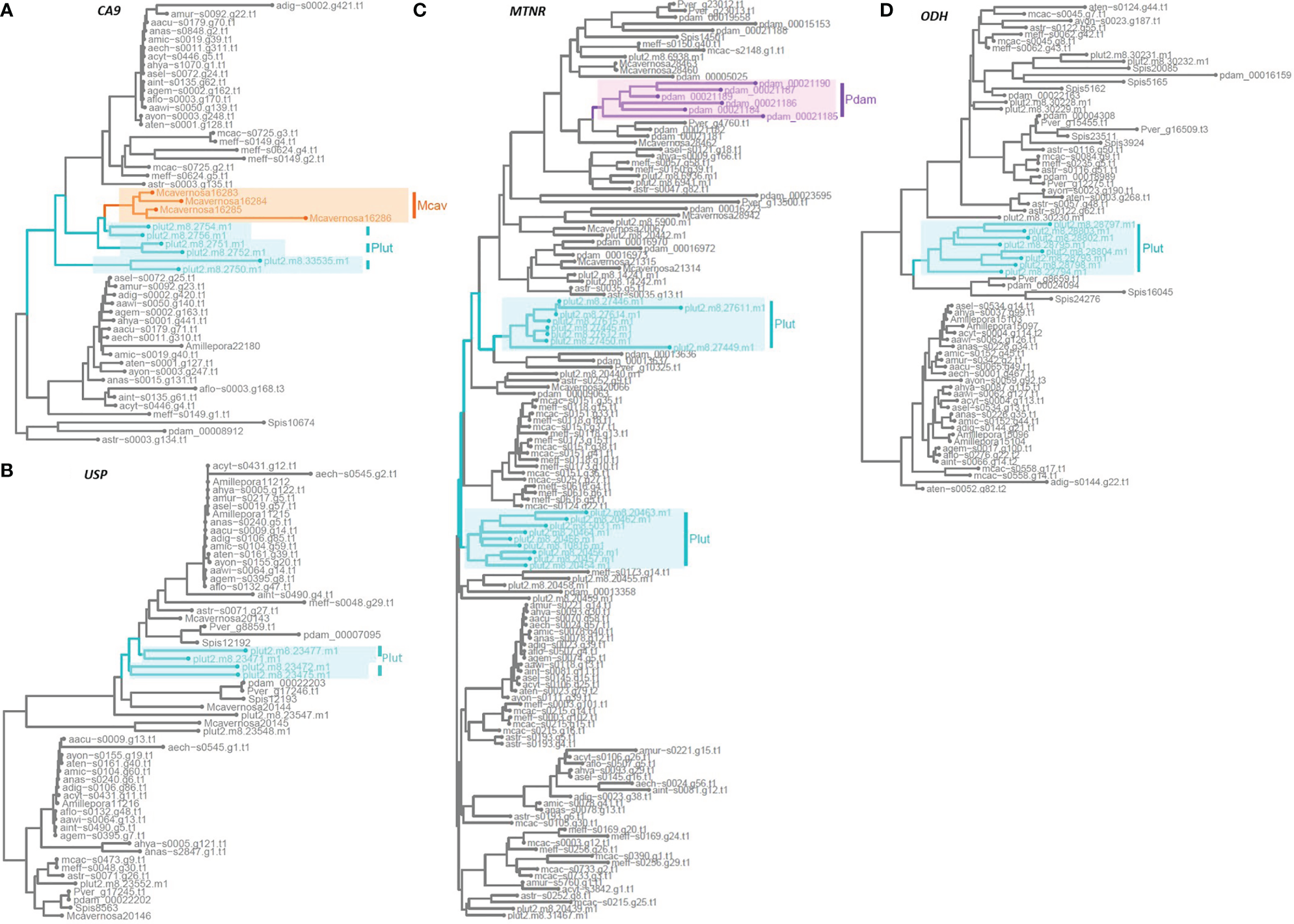 Figure 3 Rooted phylogenetic gene trees across 24 coral species showing species-specific expansions of hypoxia-associated genes that exhibit disparate copy number variation: (A) Carbonic anhydrase 9, CA9; (B) Universal stress protein, USP; (C) Melatonin receptor, MTNR; (D) Octopine dehydrogenase, ODH. Species-specific expansion of > 2 genes in a cluster for each gene family is indicated by the following highlighted boxes: Plut, Porites lutea in turquoise; Pdam, Pocillopora damicornis in purple; and Mcav, Montastraea cavernosa in orange.