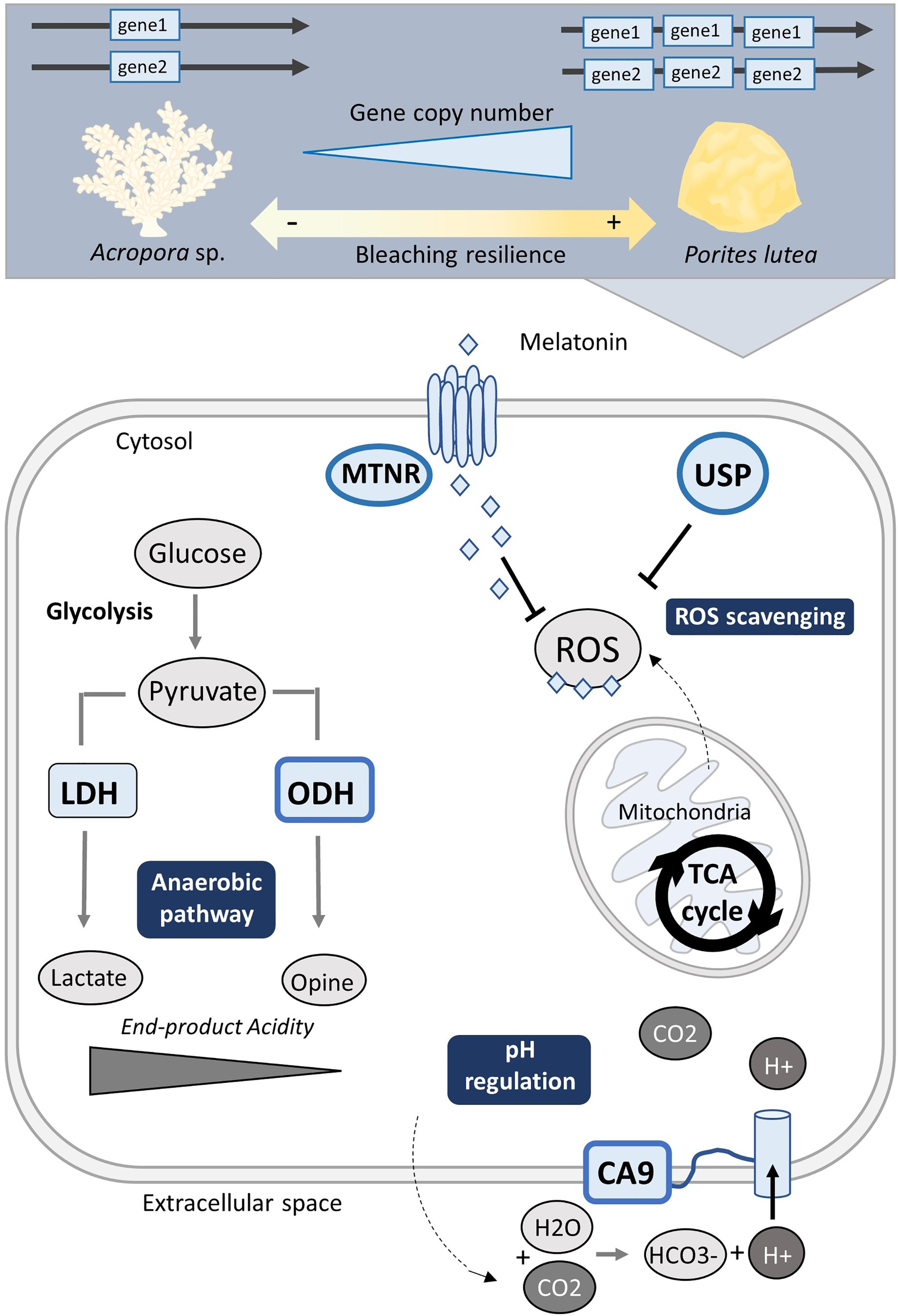 Figure 4 Hypoxia stress gene set expansion may coincide with increased coral stress tolerance and bleaching resilience. Schematic illustration of hypoxia-stress associated genes with > 2 independent expansions: melatonin receptors (MTNR), universal stress protein (USP), octopine dehydrogenase (ODH), and carbonic anhydrase 9 (CA9). Genes represented by a thick blue frame were found expanded in Porites lutea, a species ascribed as more stress tolerant, in contrast to Acropora species.