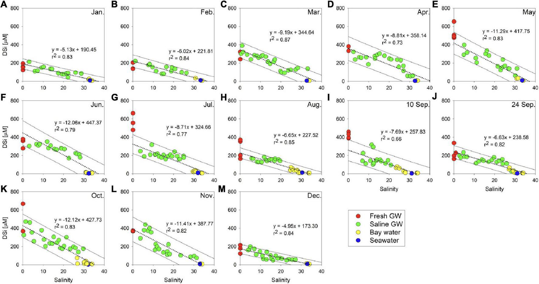 Scatter plots between dissolved silicon (DSi) and salinity in each sampling campaign. The dotted lines indicate the regression lines for the saline groundwater, bay water, and seawater. The solid lines indicate the boundaries of the 95% prediction intervals for the variable.