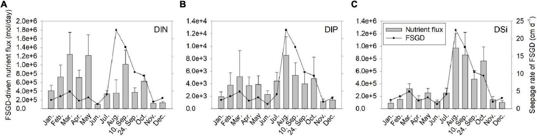 Monthly variations of FSGD-driven nutrient fluxes of DIN (A), DIP (B), and DSi (C) and seepage rate of fresh submarine groundwater discharge in Hwasun Bay.
