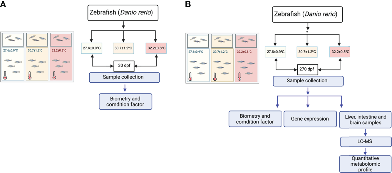 Experimental setup. (A) Schematic diagram of the experimental setup 30 dpf. (B) Schematic diagram of the experimental setup 270 dpf.