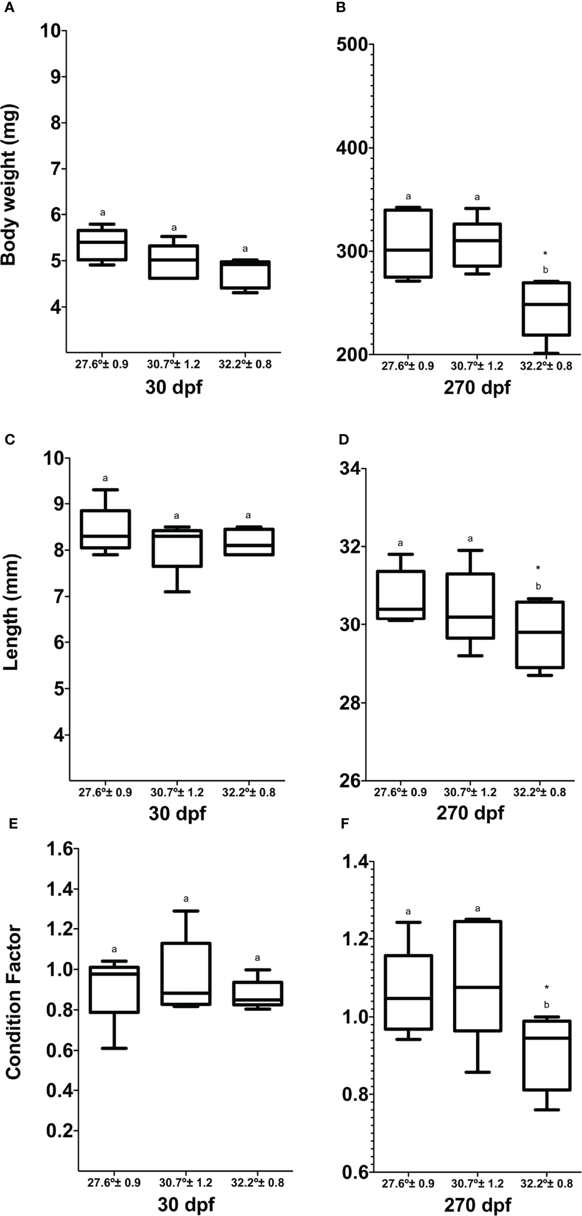 Analysis of biometric parameters and condition factor of Danio rerio during the experimental period. (A) Body weight 30 dpf, (B) body weight 180 dpf, (C) length 30 dpf, (D) length 180 dpf, (E) condition factor 30 dpf, (F) condition factor 180 dpf. Different letters correspond to significant differences among temperature groups for each time point. Asterisk denotes significant change over time within each temperature group. Values are means ± SEM (n=27 for each experimental group).