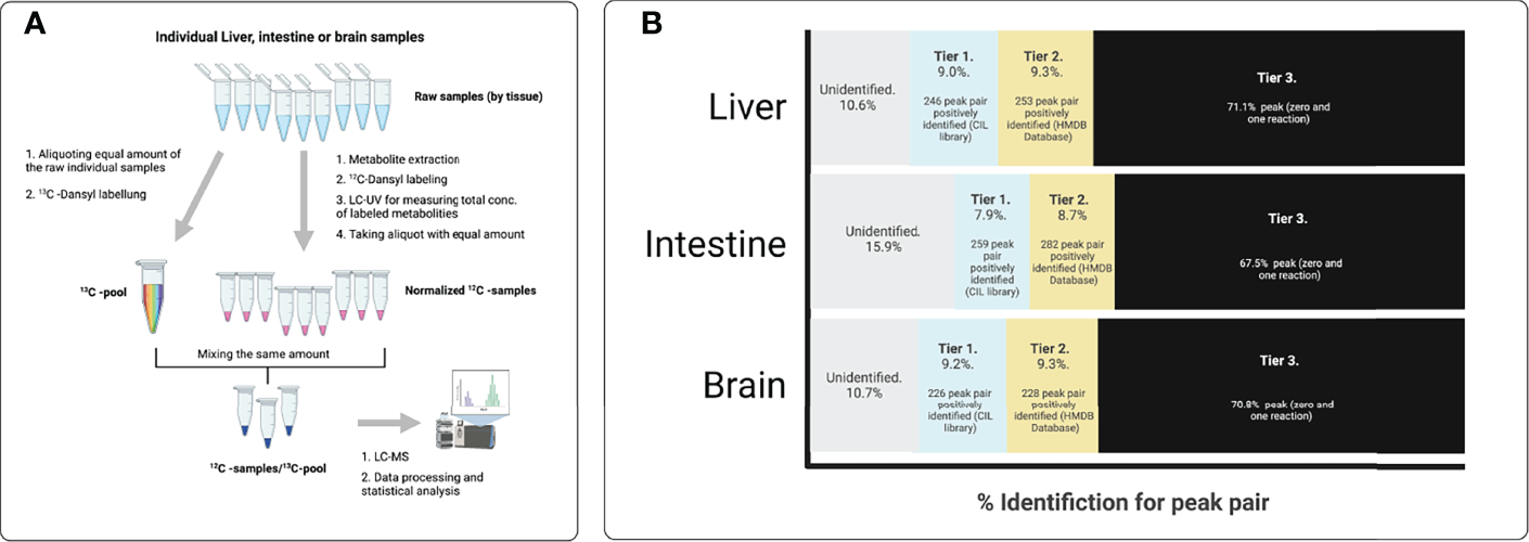 Workflow of the differential chemical isotope labeling LC-MS method for tissue metabolomic profiling. (A) Procedure for analyzing individual samples within liver, intestine or brain. (B) Identification results for each peak pair in liver, intestine or brain in each thermal set-up. Metabolites identified in tier 1 and tier 2 correspond to high confidence identified results, and were used for pathway analysis the pathway analysis tools (CIL Library and Pathway Analysis module in MetaboAnalyst. Metabolites that were identified in tier 1 and tier 2 are shown in Supplemental Tables 1–6.
