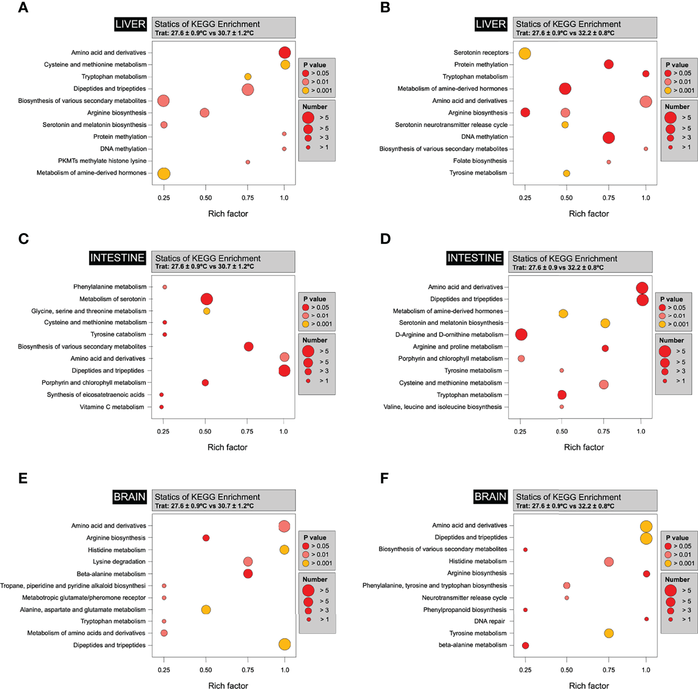 Bubble diagrams of different metabolites between tissues. The abscissa in the bubble graphs represents the Rich factor (the ratio of the number of differentially expressed metabolites in the corresponding pathway to the total number of metabolites annotated by the pathway detection; the greater the value, the greater the degree of enrichment), while the ordinate is the name of the passage. A deeper red colour of the points indicates that the enrichment is more significant. The size of the spots represents the number of enriched differential metabolites. (A) A bubble diagram of the differential metabolites of Liver individuals at 27.6 ± 2°C and 30.7 ± 2°C. (B) A bubble diagram of the differential metabolites of Liver control individuals 27.6 ± 2°C and 32.7 ± 2°C. (C) A bubble diagram of the differential metabolites of Intestine individuals at 27.6 ± 2°C and 30.7 ± 2°C. (D) A bubble diagram of the differential metabolites of Intestine individuals at 27.6 ± 2°C and 32.7 ± 2°C. (C) A bubble diagram of the differential metabolites of Brain individuals at 27.6 ± 2°C and 30.7 ± 2°C. (D) A bubble diagram of the differential metabolites of Brain individuals at 27.6 ± 2°C and 32.7 ± 2°C.