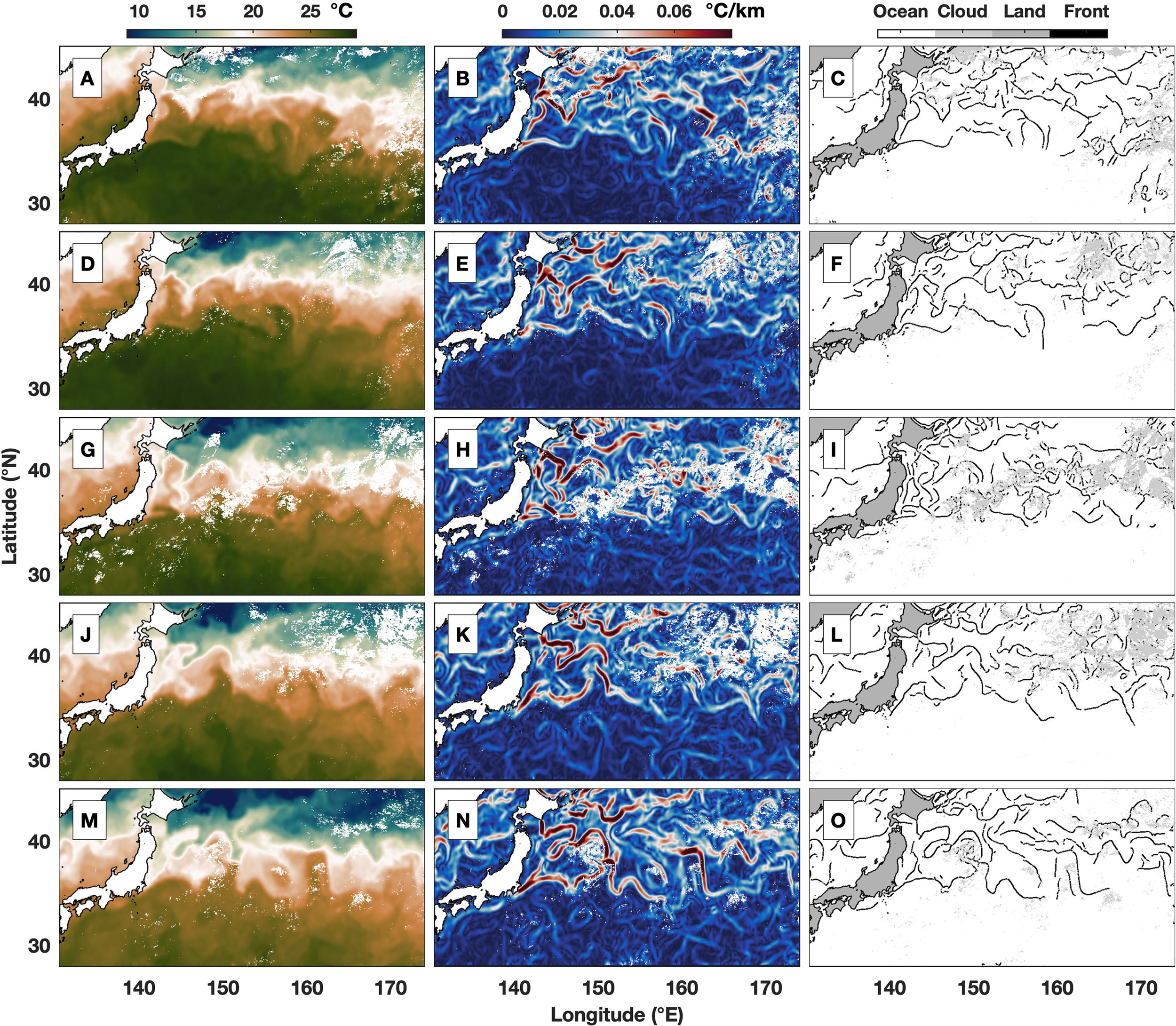 Figure 1 Example of sea surface temperature (SST) front detection using 11-day averaged (A, D, G, J, M) SST (°C), (B, E, H, K, N) SST gradient magnitude (°C/km), and (C, F, I, L, O) identified SST front. The middle time of average is (A–C) September 4, (D–F) September 15, (G–I) September 26, (J–L) October 7, and (M–O) October 18, 2002.