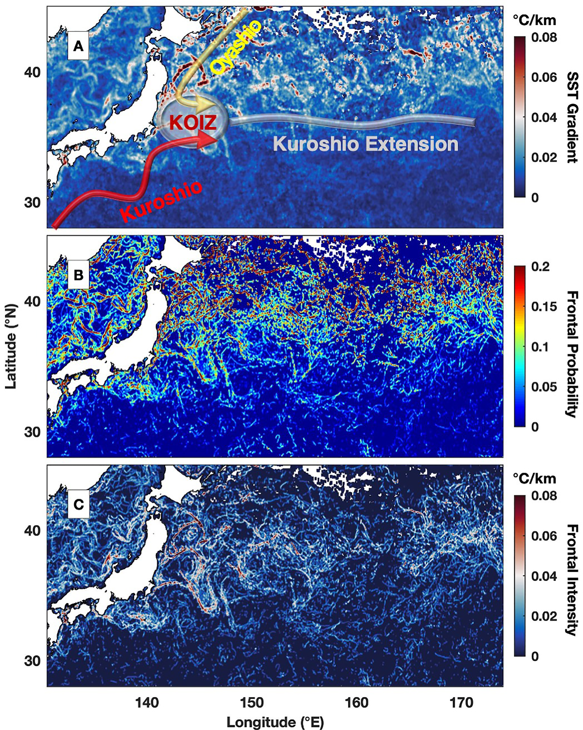 Figure 2 An example of monthly averaged (A) SST gradient (°C/km), (B) frontal probability and (C) frontal intensity (°C/km) in August 2008 for the Kuroshio Extension region. The blank area over the ocean indicates that the region is persistently obstructed by clouds during the month. The Kuroshio Current, Oyashio Current, Kuroshio-Oyashio Interfrontal Zone (KOIZ) and Kuroshio Extension are schematically shown in panel (A).